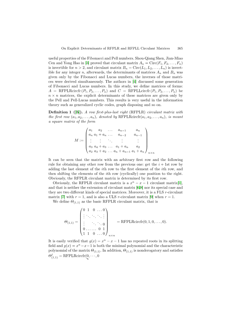 在文献[2][3][10]中有对一些特殊数的研究并且在文献[4][11]中有它们的简略概括,这很有趣。在文献[2]中,作者给出了关于Fibonacci数和Pell数的一些有用的性质。沈守强,岑建苗和郝勇在文献[3]中证明了循环矩阵在的条件下是可逆的,并且循环矩阵在n取任意值时都可逆。之后,矩阵和的行列式只能由Fibonacci数和Pell数定义,这些矩阵的逆矩阵同时也被推到出来了。文献4中的作者讨论了关于Fibonacci数和Pell数的一些广义性质。在本文中,我们定义矩阵和是阶的矩阵,这些矩阵的显式行列式仅能由Fibonacci数和Pell数给出,这个结论在信息理论中是非常有用的,比如说广义循环码,图形等信息理论等等。