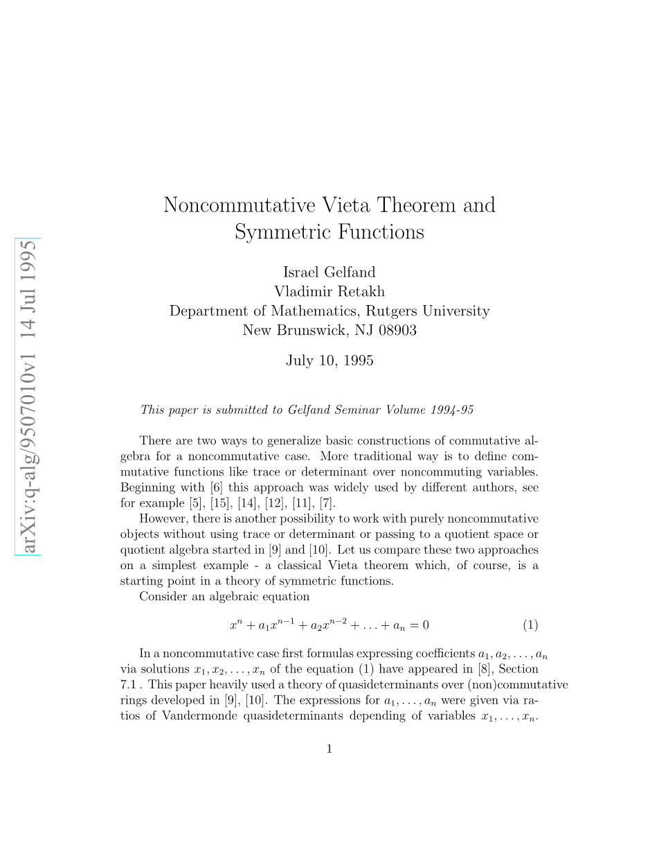 然而,在[9]和[10]中开始的另一种可能性是使用纯非非交换对象而不使用痕迹或行列式或传递到商空间或商代数。让我们在一个最简单的例子上比较这两种方法 - 一个经典的韦达定理,当然,它是对称函数理论的起点。