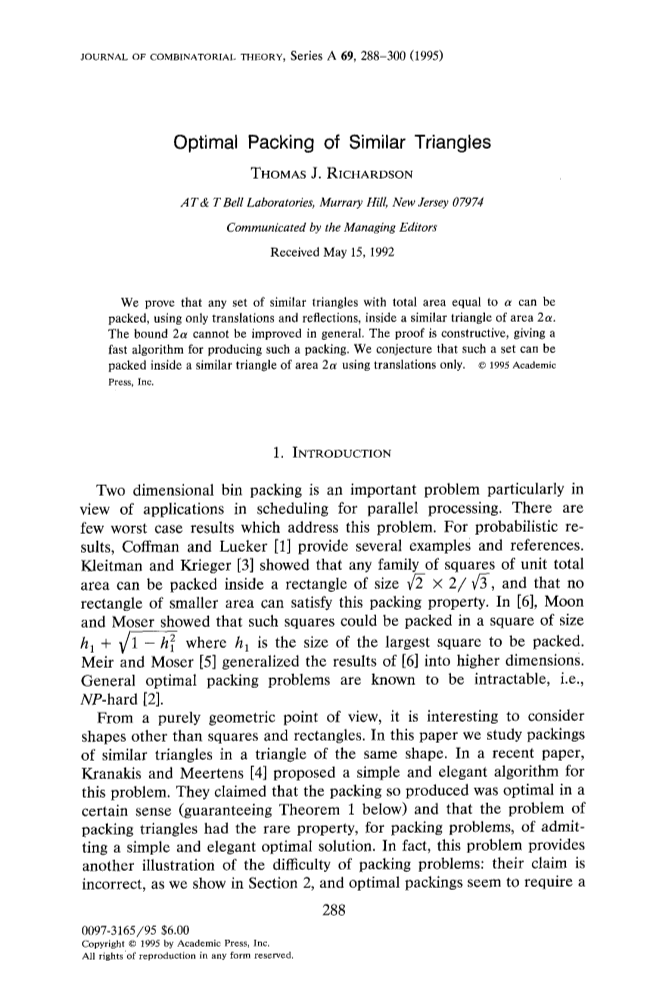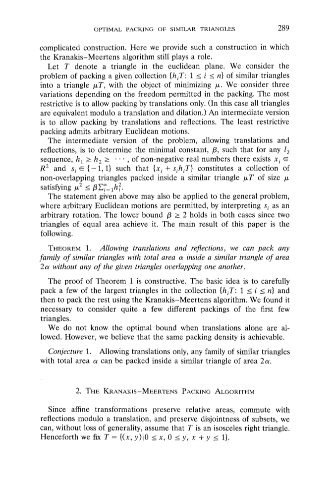 从纯几何的角度来看,考虑正方形和矩形以外的形状。在本文中,我们研究包装形状相同的三角形中的相似三角形。在最近的一篇论文中,Kranakis和Meertens[4]提出了一种简单而优雅的这个问题。他们声称这样生产的包装在一定意义(下面的保证定理1)和对于包装问题,三角包装具有一个简单而优雅的最优解决方案的罕见特性。事实上,这个问题提供了包装难题的另一个例证:他们的主张是不正确,如第2节所示,最佳填料似乎需要复杂的结构。在这里我们提供这样一种结构Kranakis-Meertens算法仍然发挥着作用。