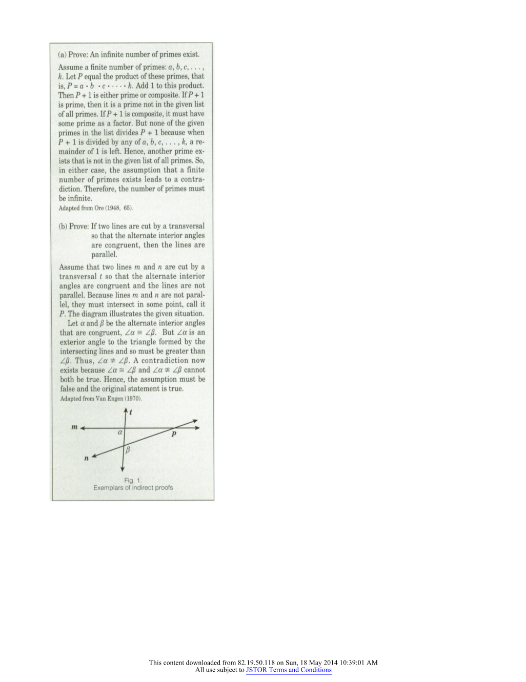 在本文中,间接证明是指古希腊人所熟知的矛盾证明法。有些课程教材使用间接论证和间接推理这两个术语来指称对位证明;然而,以这种方式指称间接证明可能会产生误导,因为对位论证是演绎论证的一种直接形式(Bell 1978)。图1包含两个使用间接证明来证明语句的例子:(a)中的证明版本可以在《欧几里得原理》第九卷中找到。矛盾证明一般用于两种陈述:如(a)中的存在性陈述和(b)中的条件性陈述。使用间接证明涉及特定策略,无论证明哪种类型的陈述。首先假设,否定要证明的陈述。然后,通常通过直接证明策略,使用这种假设导致矛盾,即两个相互对立的陈述。因此,假设必定是假的,即,它的否定——原始陈述在逻辑上是正确的(Dossey et al 1987;Roberti 1987;Van Engen 1970)。