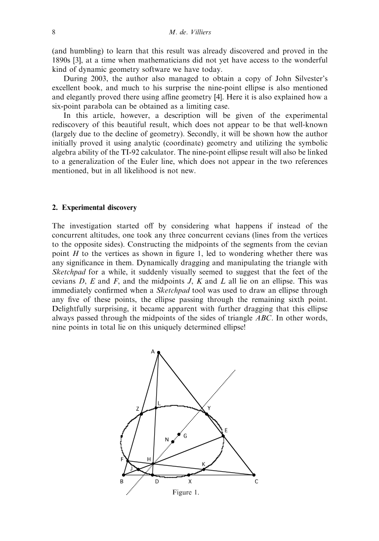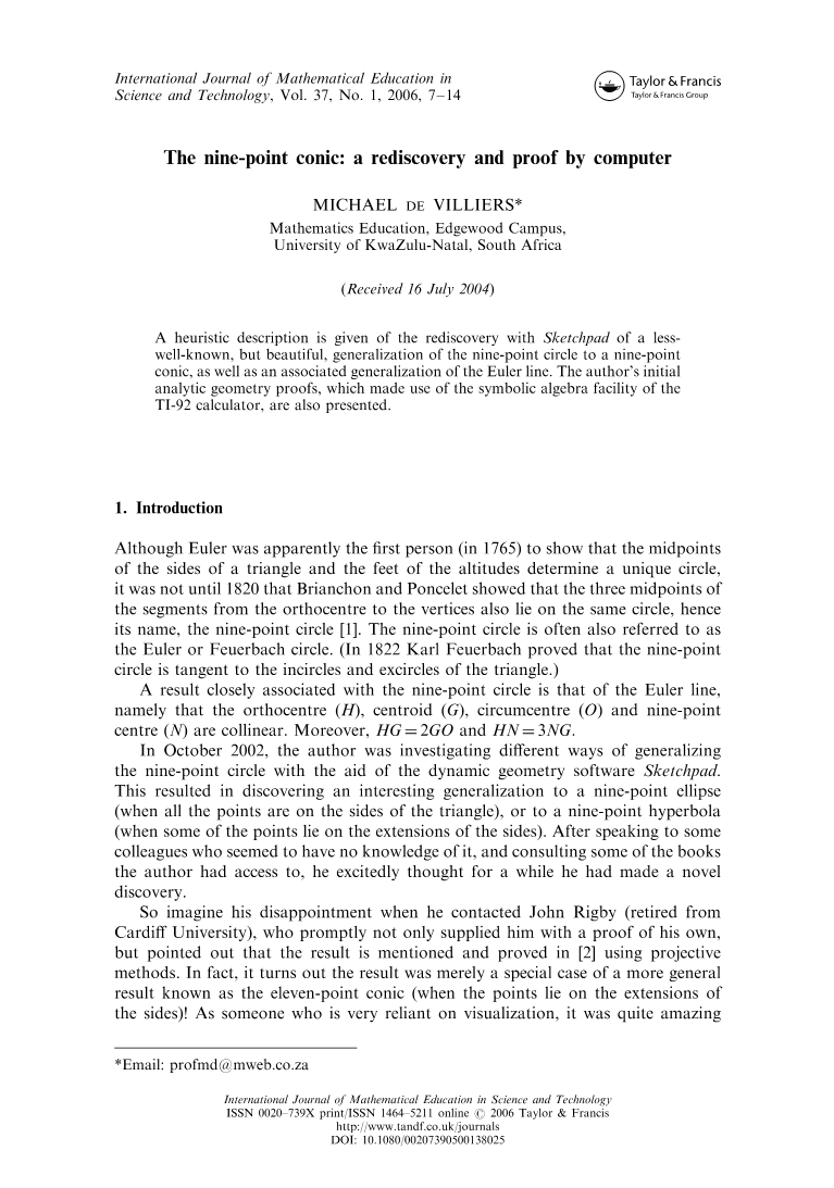 2002年10月,作者利用动态几何软件几何画板研究了九点圆的不同泛化方法.这导致发现了一个有趣的推广,到一个9点椭圆(当所有的点都在三角形的边上时),或到一个9点双曲线(当一些点位于边的扩展上时).在与一些似乎对此一无所知的同事交谈之后,并查阅了一些作者可以接触到的书籍之后,他兴奋地想了一会儿,他有了一个新的发现.