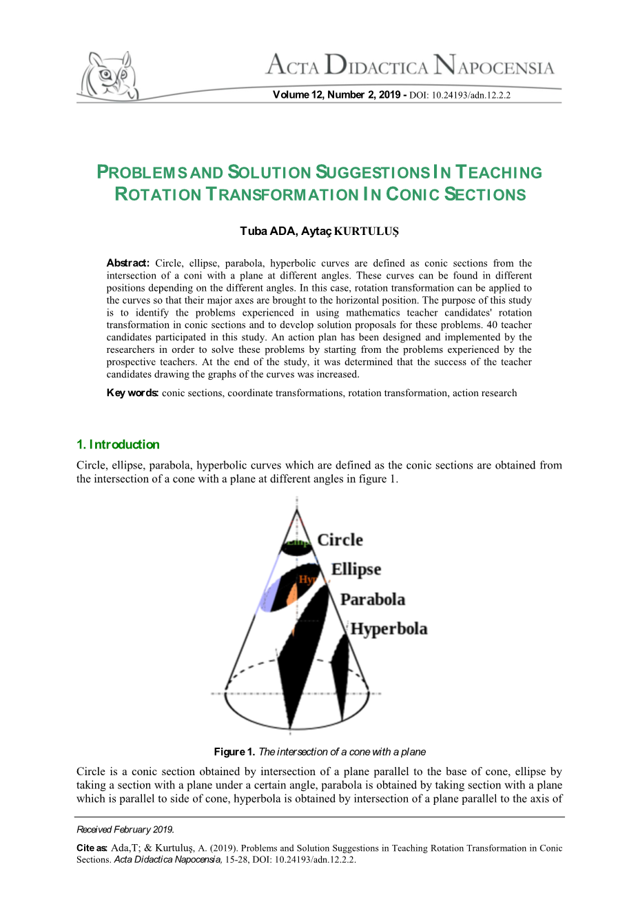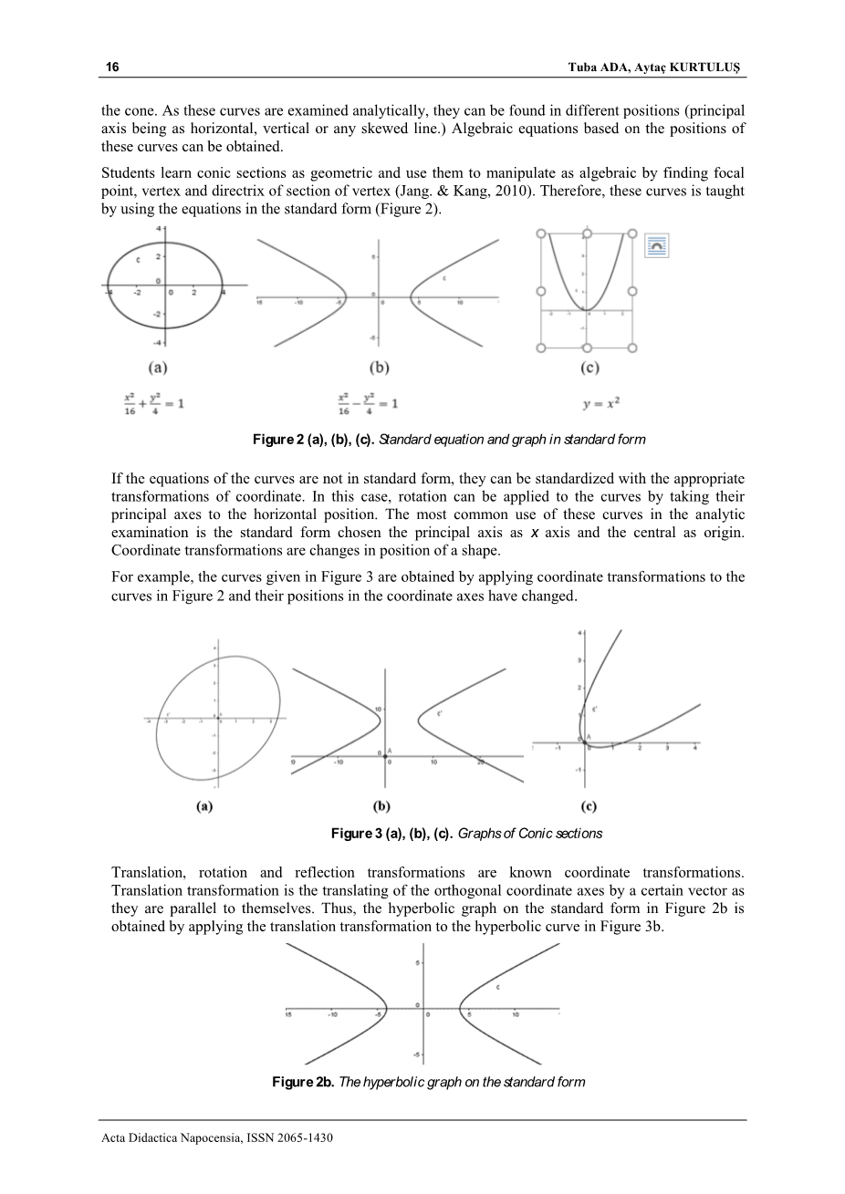 Ada and Kurtulus (2010, p.91)认为,对复杂的代数方程进行适当的坐标变换,化简为标准形式,就可以确定曲线表示的是哪条曲线。另一方面,通过确定对一组几何定义的点进行旋转变换的旋转点、角度和方向,可以确定曲线的新位置。在这种情况下,根据Hollebrand(2003),坐标变换是重要的,因为它为学生提供了考虑重要数学概念(如函数、对称性)的机会,提供了一个可以将数学看作是一门相互依存的学科的背景,并为学生提供了发展高水平推理技能的机会。