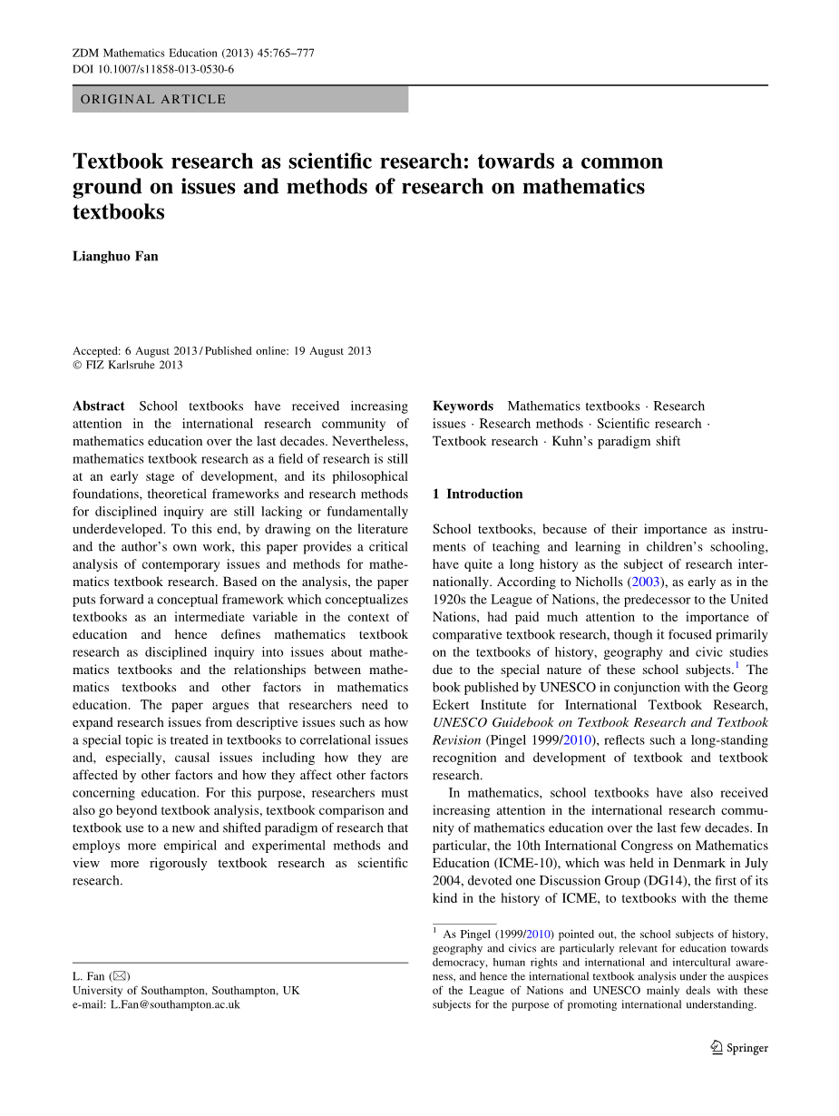 然而,与数学教育的其他研究领域相比,数学教科书研究作为一个研究领域,总体上还处于发展的初级阶段。与其他学校学科的教科书研究一样,数学教科书研究中不同问题纪律探究的哲学基础、理论框架和研究方法仍然缺乏或根本不发达。在这方面,数学教育研究人员必须开始更严格地考虑将教科书研究作为一个科学研究领域,从而为基本假设和知识框架建立一个共同基础或“共享范式”(Kuhn 1962)2。为此,本文借鉴文献资料和作者自己的研究成果,对研究问题进行了批判性的分析以及数学教材研究的方法,并在此基础上建立了以数学教材为研究对象的概念框架。