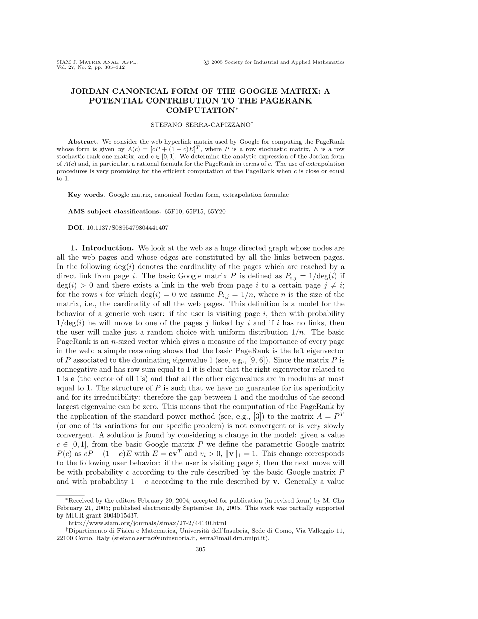 - 引言:我们将网页看作一个巨大的有向图,其节点是所有网页,其边缘由页面之间的所有链接构成。在下面,deg(i)表示从页面直接链接到达的页面的基数。基础谷歌矩阵P定义如下:如果deg(i)gt; 0并且网页中存在从第i页到某个页面j的链接i;对于其中deg(i)= 0的行i为Pi,j = 1 /deg(i),我们假设Pi,j = 1 / n,其中n是的大小矩阵,即所有网页的基数。此定义是通用网页用户行为的模型:如果用户正在访问页面i,则概率为1 / deg(i)他将移动到由i链接的页面j之一,如果没有链接,那么用户将只做一个随机选择,均匀分布1 / n。基本网页级别是一个n大小的向量,它可以衡量网络中每个页面的重要性:一个简单的推理表明,基本网页级别是与主要特征值1相关的P的左特征向量(参见[6],[9])。由于矩阵P是非负的并且行和等于1,很明显与1相关的右特征向量是e(所有1的向量)并且所有其他特征值的模数最多等于1。因为P是这样的,我们不能保证它的非周期性和它的不可约性:因此1和第二大特征值的模数之间的差距可以是零。这意味着网页级别的计算标准幂方法(见[3])在矩阵A = P t中的应用(或者我们特定问题的变化之一)不收敛或非常缓慢收敛。通过考虑模型的变化找到解决方案:给定值cisin;[0,1],从基本的谷歌矩阵P中我们定义参数化的谷歌矩阵P(c)为cP (1 - c)E,其中E =evT且vigt; 0,||v||1 = 1.此变化对应以下用户行为:如果用户正在访问第i页,则下一步将进行根据基本谷歌矩阵P描述的规则,使用概率c和可能概率为1-c,根据v描述的规则。通常是一个值,在文献中考虑c为0.85(参见[6])。对于c lt;1,可以得到PageRank(c),即左支配特征向量,可以快速计算,因为P(c)(现在有行和1,非负,不可约和非周期)具有第二个特征值,其模数由c [4]支配:因此,收敛到PageRank(c)使得步骤k的误差衰减为ck。当然,如果c被选择为接近1,则计算变慢,并且如果c = 1则不能保证收敛。在本文中,给定基本谷歌矩阵P的若当标准形,我们以分析方式描述若当标准形。 特别是我们获得了谷歌矩阵P(c)的形式: