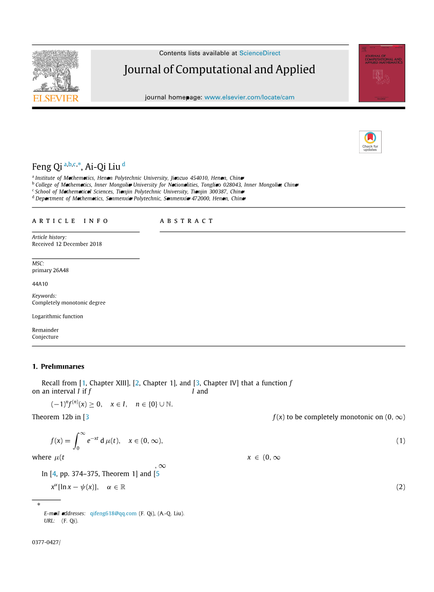在上是完全单调的。因此,当时,函数在上是完全单调的,详细可见[31,第1.4节]和[32,定理3.1]。当时,函数是渐近公式的余数。详细可见[6, p. 257, 6.1.40]和[7, p. 140, 5.11.1]。