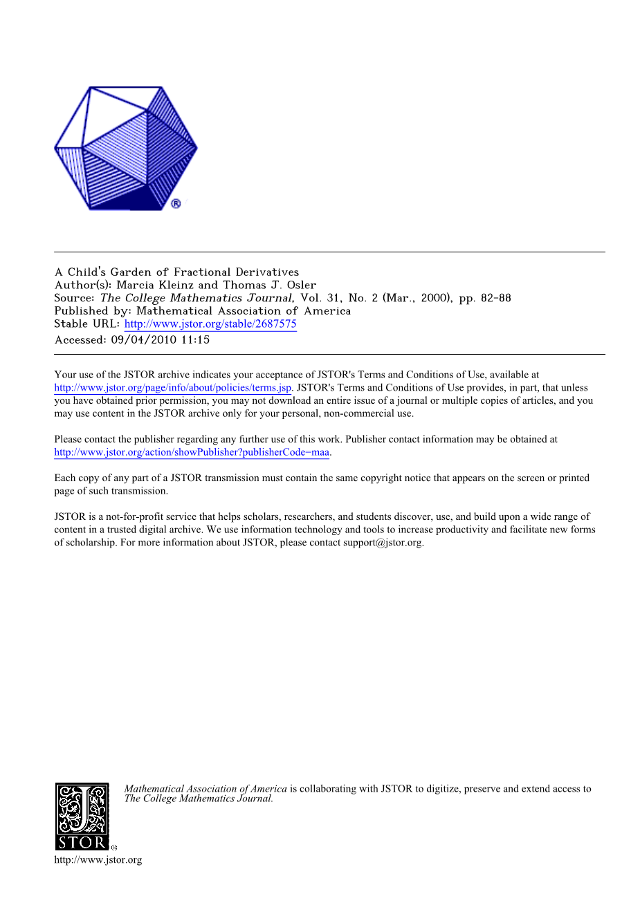 对任意一个,无论是整数,有理数,无理数,还是复数。当是负整数时,考虑(1)式的意义是很有趣的。我们自然希望有成立。因为,所以我们有。同理。当是负整数时,我们将看作是n次迭代的积分是合理。当是正实数,代表导数,当是负实数,代表积分。