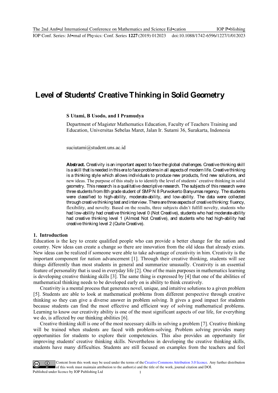 Abstract. Creativity is an important aspect to face the global challenges. Creative thinking skill is a skill that is needed in this era to face problems in all aspects of modern life. Creative thinking is a thinking style which allows individuals to produce new products, find new solutions, and new ideas. The purpose of this study is to identify the level of studentsrsquo; creative thinking in solid geometry. This research is a qualitative descriptive research. The subjects of this research were three students from 8th grade student of SMP N 8 Purwokerto Banyumas regency. The students were classified to high-ability, moderate-ability, and