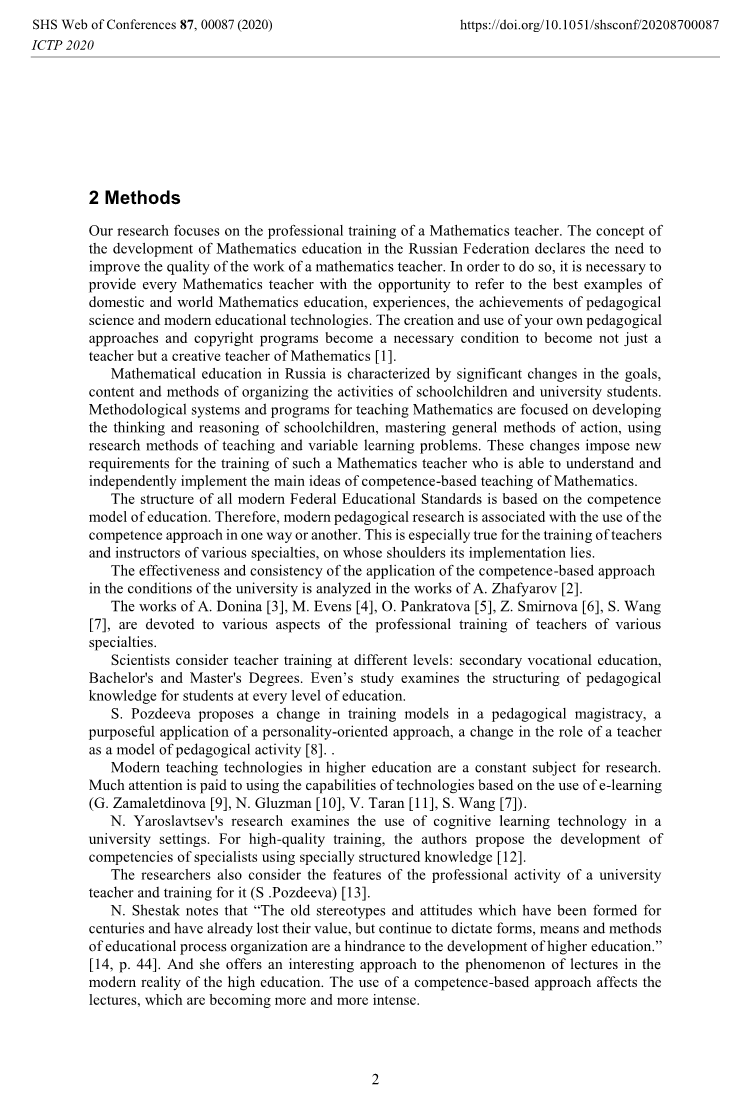 现代教学技术在高等教育中的应用是一个不断研究的课题。重点关注基于电子学习的技术能力的使用。雅罗斯拉夫采夫的研究调查了认知学习技术在大学环境中的使用情况。对于高质量的培训,笔者建议开发使用特殊结构知识的专家的能力。研究人员还考虑了大学教师的专业活动及其培训的特点。Shestak指出,已经形成了几个世纪的旧的刻板印象和态度已经失去了它们的价值,但仍然支配着教育过程组织的形式、手段和方法,阻碍了高等教育的发展。她提供了一个有趣的方法来研究现代高等教育现实中的讲座现象。以能力为基础的教学方法的使用使课堂教学正变得越来越紧张。在Lukin的文章中描述了物理和数学专业学生第一节教学课的表现。这样的讲座让未来的教师不仅可以评估自己对学习的态度,而且以此作为未来专业活动的榜样。以能力为基础的数学学科研究方法与积极的教学方法成为研究的主题。研究还致力于未来数学教师的专业培训。所分析的资源并没有用尽所有致力于教师专业培训的各种出版物。在本文中,我们将分享我们自己的研究结果。