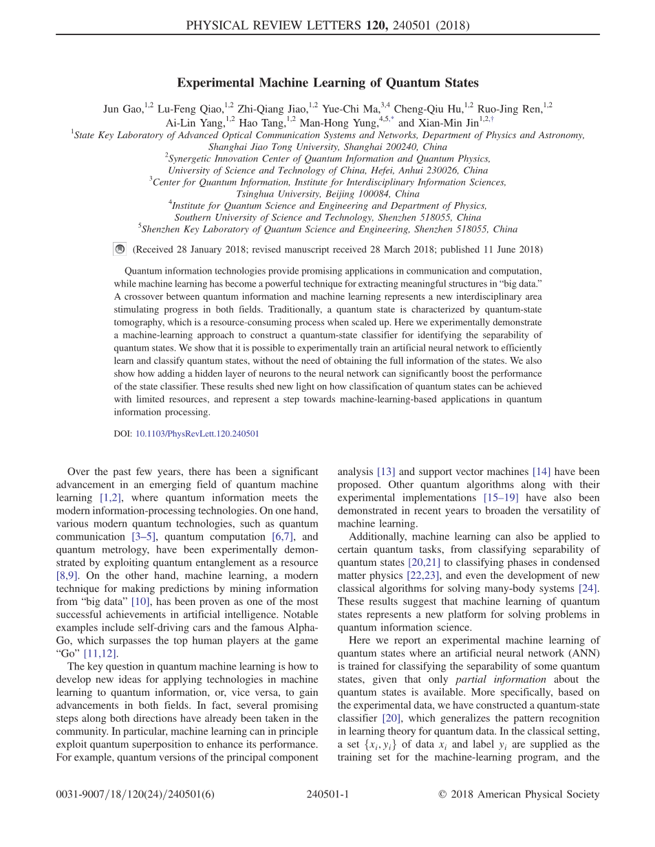 量子信息技术在通信和计算领域具有广阔的应用前景,而机器学习已经成为提取“大数据”中极具价值结构的强大技术支撑。量子信息和机器学习的交叉象征着一个新的跨学科领域,促进了这两个领域的进步。从传统意义上讲,当量子态规模扩大时,一个量子态层析成像的特征,是一个资源消耗的过程。这里,我们通过实验证明了一种机器学习方法来建构一个量子的分类器为了识别量子态的可分离性。实验结果表明,在不需要获取量子态全部信息的情况下,通过实验训练人工神经网络中添加一层隐藏的神经元可以显著提高量子态分类器的性能。这些研究成果为如何在有限的资源下实现量子态分类提供了新思路,并代表着向基于机器学习的量子信息处理应用研究又迈近了一步。