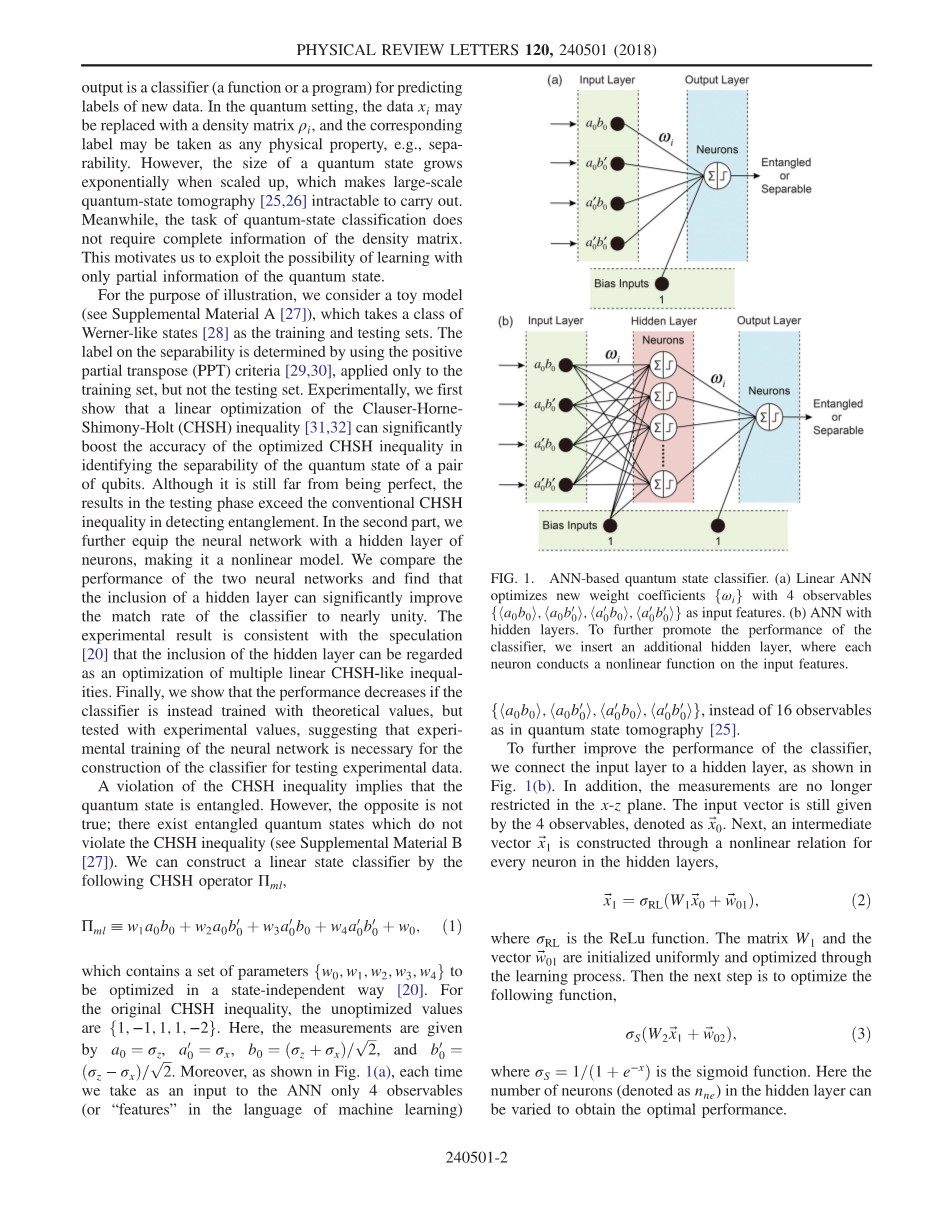 图1:基于ANN的量子状态分类器。(a)线性ANN优化新的权重系数{omega;i}与4个可观测的作为输入特性{lt;a0b0gt;,lt;a0b0rsquo;gt;,lt;a0rsquo;b0gt;,lt;a0rsquo;b0rsquo;gt;}。(b)带有隐藏层的ANN。为了进一步提高分类器的性能,我们插入了一个额外的隐藏层,其中每个神经元对输入特征进行非线性函数处理。