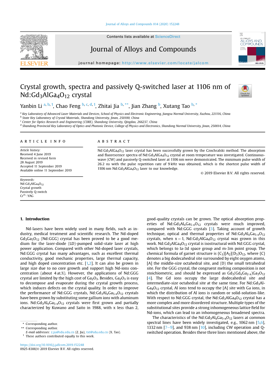 关键词:Nd:Gd3AlGa4O12;晶体生长;被动调Q开关;Cr4 :YAG晶体