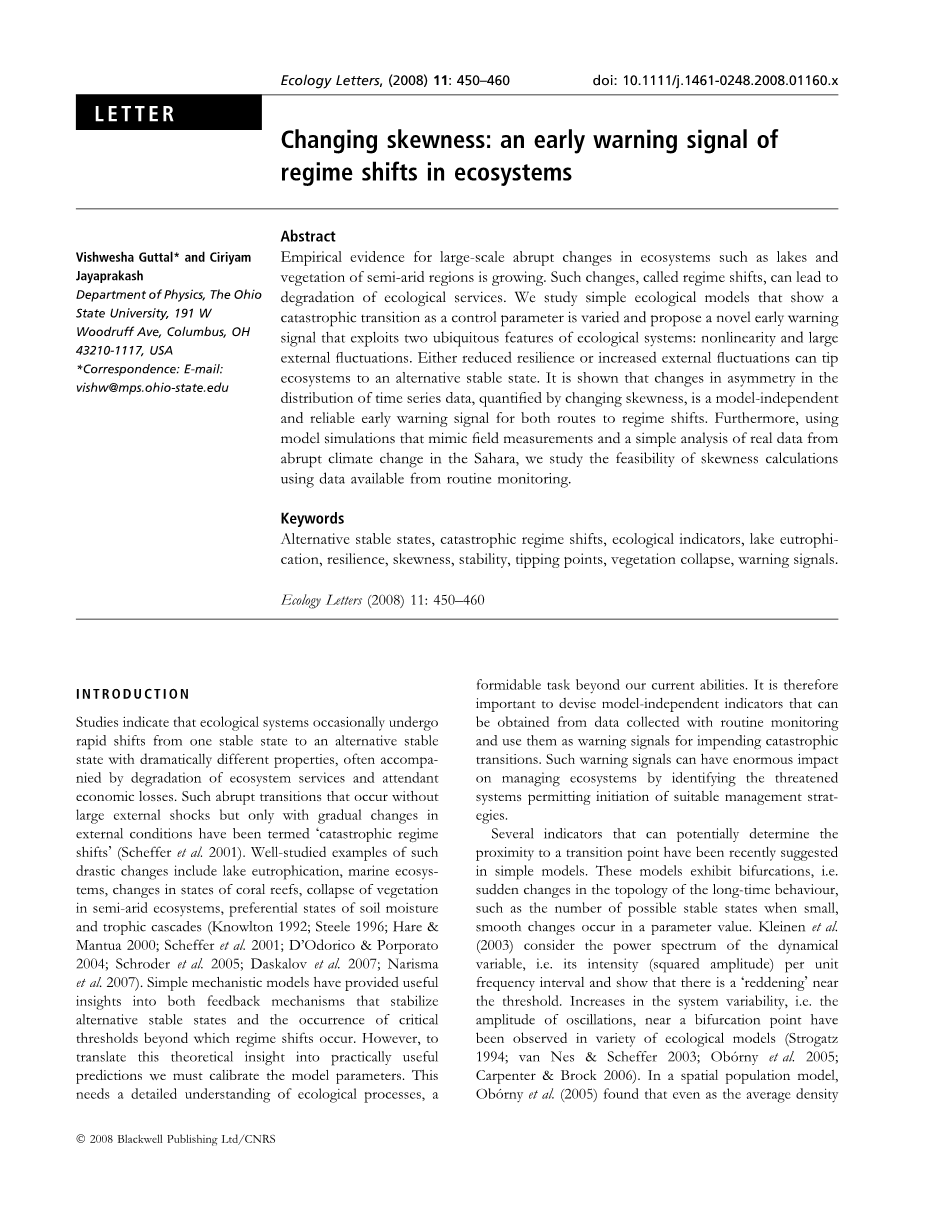 随着接近稳态转移,生态系统动态的图像呈现出在稳定状态周围显明显的不对称性,并且使势能图变平坦,即曲率减小。与通过线性分析获得的图像平坦化相反,不对称性是由非线性效应引起的,因此提供了设计早期预警信号的新方法。在本文中,我们利用景观中巨大的外部波动和不对称性对生态系统动力学的影响,并指出时间序列概率分布的偏度的变化(衡量变化的不对称性)可能是体制变化的一个有效的预警信号。一般而言,体制的变化可以发生在接近阈值时外部参数变化(传统上在动力系统理论和上述各种生态学研究中进行研究),也可以发生在由于外部噪声分布宽度的增加的时候。 (Scheffer等人2001; Guttal&Jayaprakash 2007)。鉴于现有的一套指标通常只能用作前一种情况的警示信号,但表明偏度的变化是这两条体制转移路线的有保障的指标。