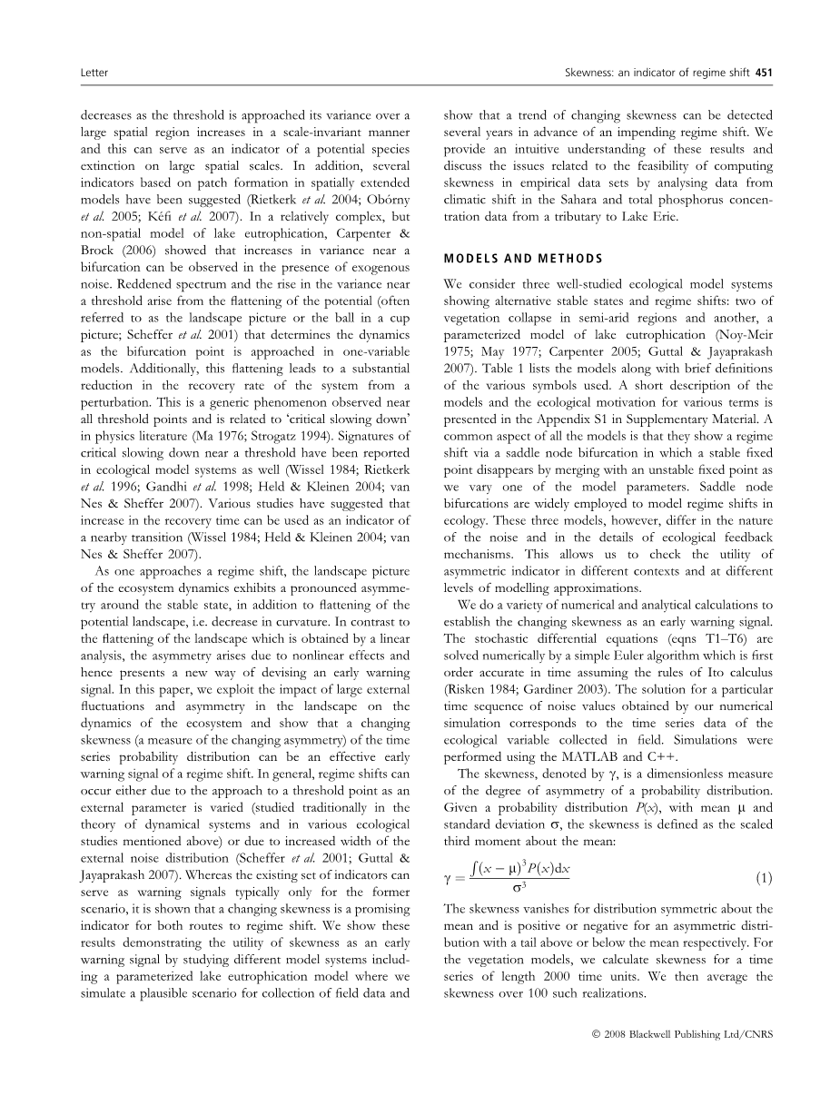 我们考虑三个研究得很好的生态模型系统,显示出多态状态和体制转移:半干旱地区的两个植被崩塌模型和另一个湖泊富营养化的参数化模型(Noy-Meir 1975; 1977年5月; Carpenter 2005; Guttal&Jayaprakash 2007)。表1列出了模型以及所用各种符号的简短定义。有关各种术语的简要描述和各种术语的生态动机在补充材料的附录S1中给出。所有模型的一个共同点是,它们通过鞍结分岔显示出一种状态转移,即当我们改变一个模型参数时,通过与不稳定的不动点合并,最后稳定的不动点消失。鞍结分岔被广泛用于模拟生态环境的变化。然而,这三种模式在噪音的性质和生态反馈机制的细节方面有所不同。这使我们能够检查不对称指标在不同背景下和不同建模逼近水平下的效用。