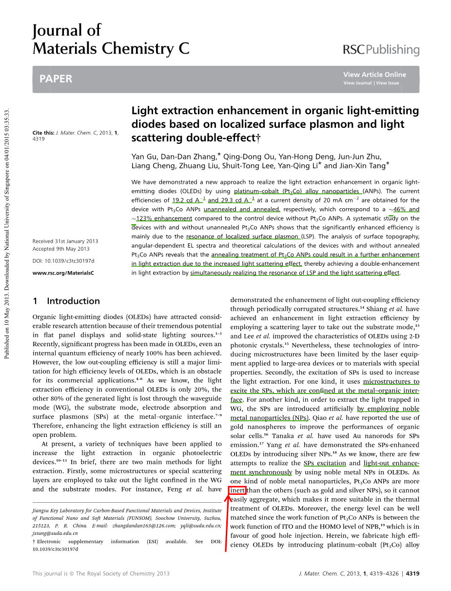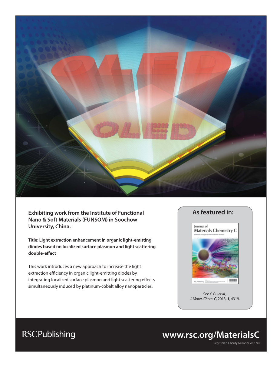 我们已经通过使用铂-钴(Pt3Co)合金纳米颗粒(ANPs)论证了一种新的方法来实现有机发光二极管(OLED)中的光提取增强。 对于具有未退火和退火的Pt3Co ANPs的器件,分别能获得19.2cd/A和29.3cd/ A的电流效率,其对应的电流密度为20mA/ cm2,与没有Pt3Co ANPs的器件相比,分别提高约46%和123%。一项有关具有和不具有未退火的Pt3Co ANPs器件的系统的研究表明,效率的显著性提高主要归因于局域表面等离子体共振。表面形貌和变角EL光谱的分析以及具有和没有退火的Pt3Co ANPs的器件的理论计算表明,由于光散射效应增强,Pt3Co ANPs的退火处理可以导致光提取的进一步增强,从而通过同时实现LSP的共振和光散射效应来实现光提取的双重增强。
