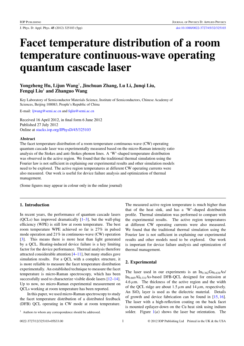 总之,使用微拉曼光谱,我们测量了在CW模式下工作的分布式反馈量子级联激光器的面温度分布曲线。有源区域中的测量温度远高于散热器的温度,并且在有源区域中具有“W”形分布。进行使用傅立叶定律的热仿真。我们发现它不能完全解释实验结果。使用双曲线热传导方程,解释了活性区域边缘处测得的较高温度。还测量了不同CW工作电流下的有源区温度。需要更好的热管理来进一步提高设备性能。我们的工作对设备故障分析和热管理优化非常有用。