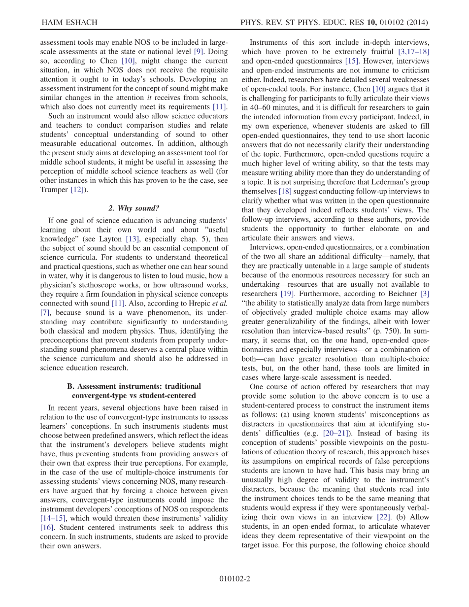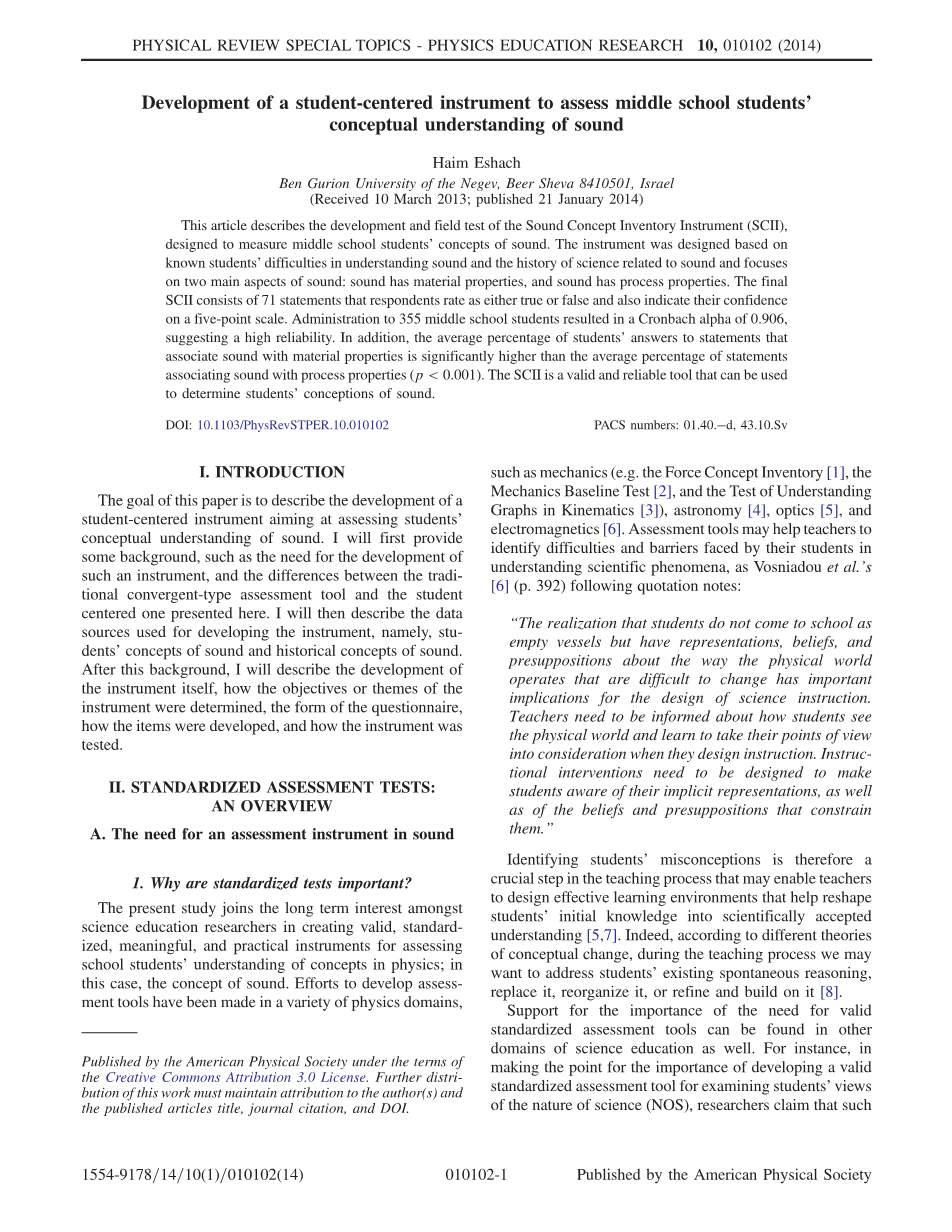 本文的目的是描述一个以学生为中心的乐器的发展,旨在评估学生对声音的概念理解。我将首先提供一些背景,比如这样一个工具的发展需要,以及传统的融合型评估工具和这里介绍的以学生为中心的评估工具之间的区别。然后,我将描述用于开发乐器的数据源,即学生对声音和历史概念的概念。在此背景下,我将介绍仪器本身的发展情况,如何确定仪器的目标或主题,问卷的形式,仪器如何开发以及如何测试仪器。