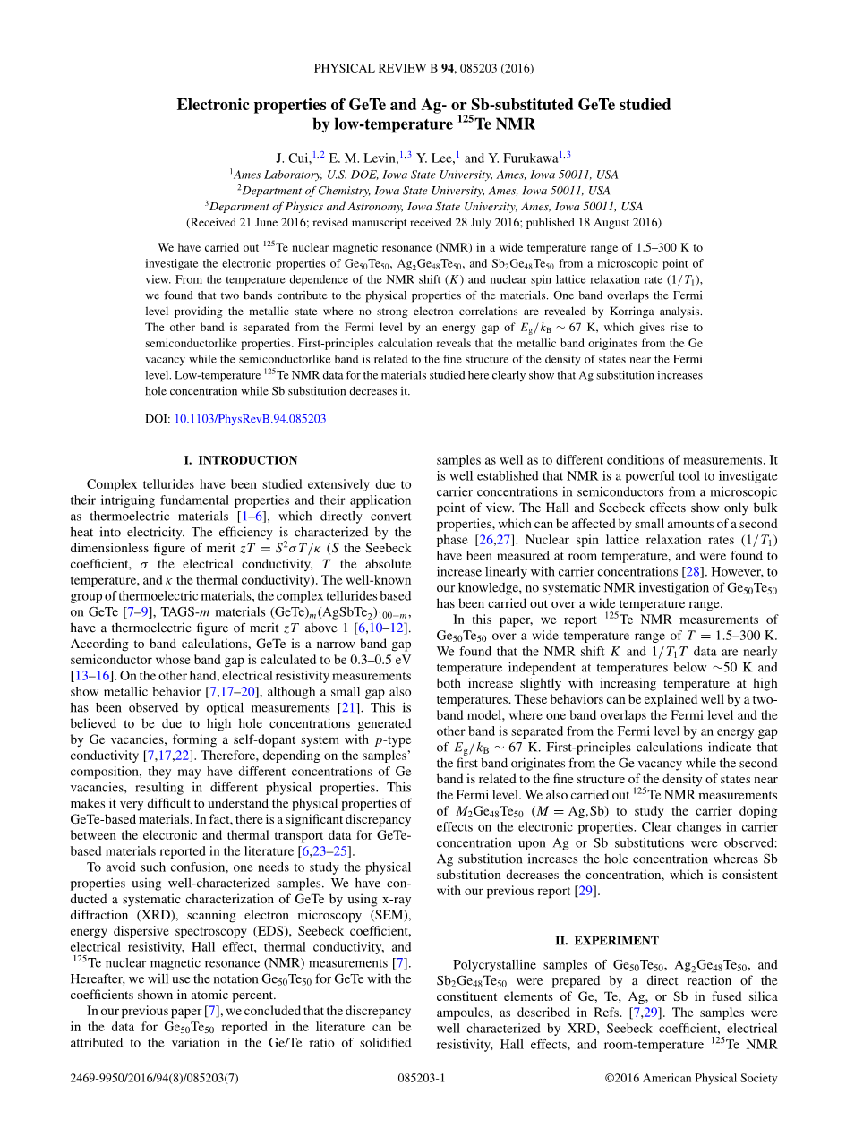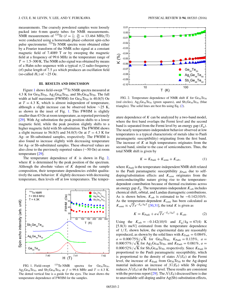 Polycrystalline samples of Ge50Te50, Ag2Ge48Te50, and Sb2Ge48Te50 were prepared by a direct reaction of the constituent elements of Ge, Te, Ag, or Sb in fused silica ampoules, as described in Refs. . The samples were well characterized by XRD, See beck coefficient, electrical resistivity, Hall effects, and room-temperature 125Te NMR measurements. The coarsely powdered samples were loosely packed into 6-mm quartz tubes for NMR measurements. NMR measurements of 125Te (I = 1/2; gamma;N/2pi; = 13.464 MHz/T) were conducted using a homemade phase-coherent spin-echo pulse spectrometer. 125Te NMR spectra were obtained either by a Fourier transform of the NMR echo signal at a constant magnetic field of 7.4089 T or by sweeping the magnetic field at a frequency of 99.6 MHz in the temperature range of T = 1.5–300 K. The NMR echo signal was obtained by means of a Hahn echo sequence with a typical pi;/2 radio-frequency (rf) pulse length of 7.5 mu;s which produces an oscillation field (so-called H1) of ~25 Oe.