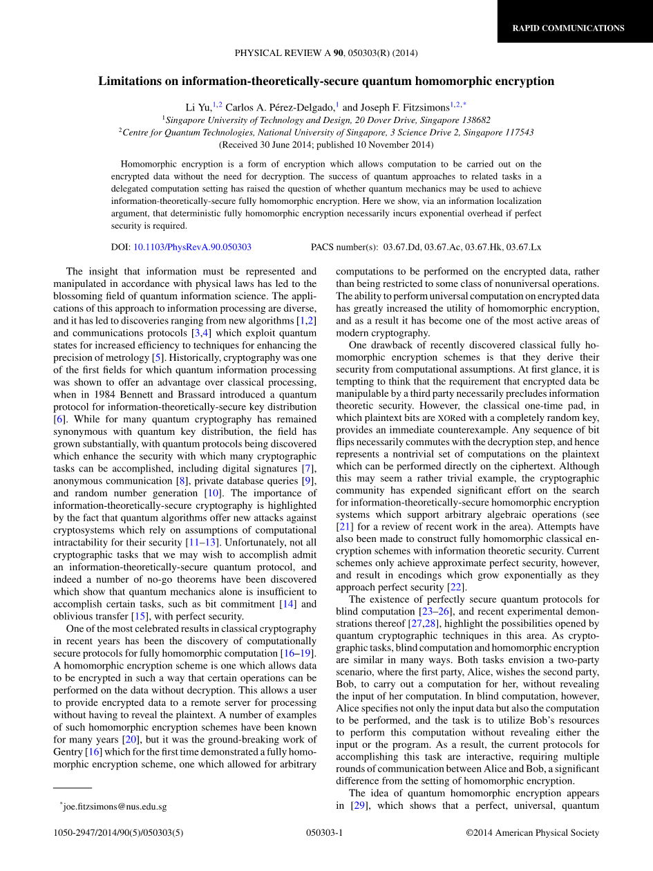 量子同态加密的思想出现于M. Liang,Quantum Inf. Proces. 12, 3675 (2013).中,它表明了一个完美的、通用的、量子同态方案不能用一次一密来构造,它提出了一个实现类似功能的交互式协议以及利用量子数据实现同态加密功能的其他加密方案。然而,这些都依赖辅助计算,因此需要Alice和Bob之间进行多轮交互,从而达到交互协议而不是简单的加密方案。量子同态加密方案确实存在于一个被称为玻色子散射的受限量子计算模型中,该模型提供有限的信息理论安全。这些方案的存在引发了一个问题,即量子技术是否可以被用来构造理论上安全的完全同态加密方案。在这里,我们通过证明量子力学不允许有效的信息理论上安全的完全同态加密完全隐藏明文来回答这个问题。为了实现这一点,我们首先将量子同态加密的概念形式化,然后通过信息局部化论证继续证明,完全隐藏Alice输入的任何此类方案都必须揭示所执行的计算,因此编码必须足够长以指定任何此类计算。对于完全同态加密方案,这意味着编码必须是指数长的,因此排除了有效的完全同态加密方案的存在,该方案完全隐藏了Alice的数据。