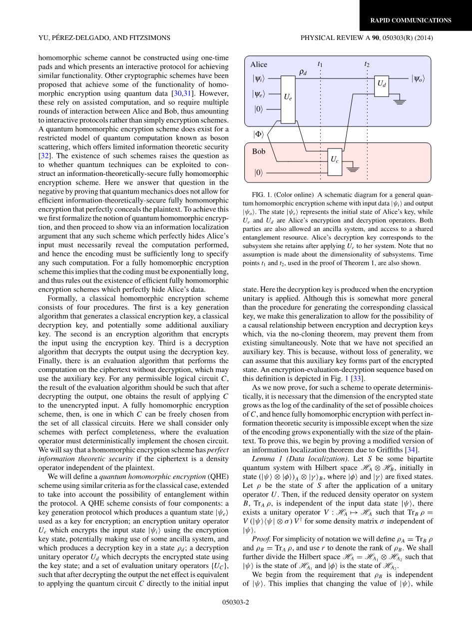 正如我们现在证明的那样,对于这样一个方案进行确定性操作,有必要使加密状态的维数随着C可能的选择集基数的对数的增长而增长,因此不可能完全同态加密,除非编码的大小呈指数增长。为了证明这一点,我们首先证明了Griffiths的信息局部化定理的修正版本。