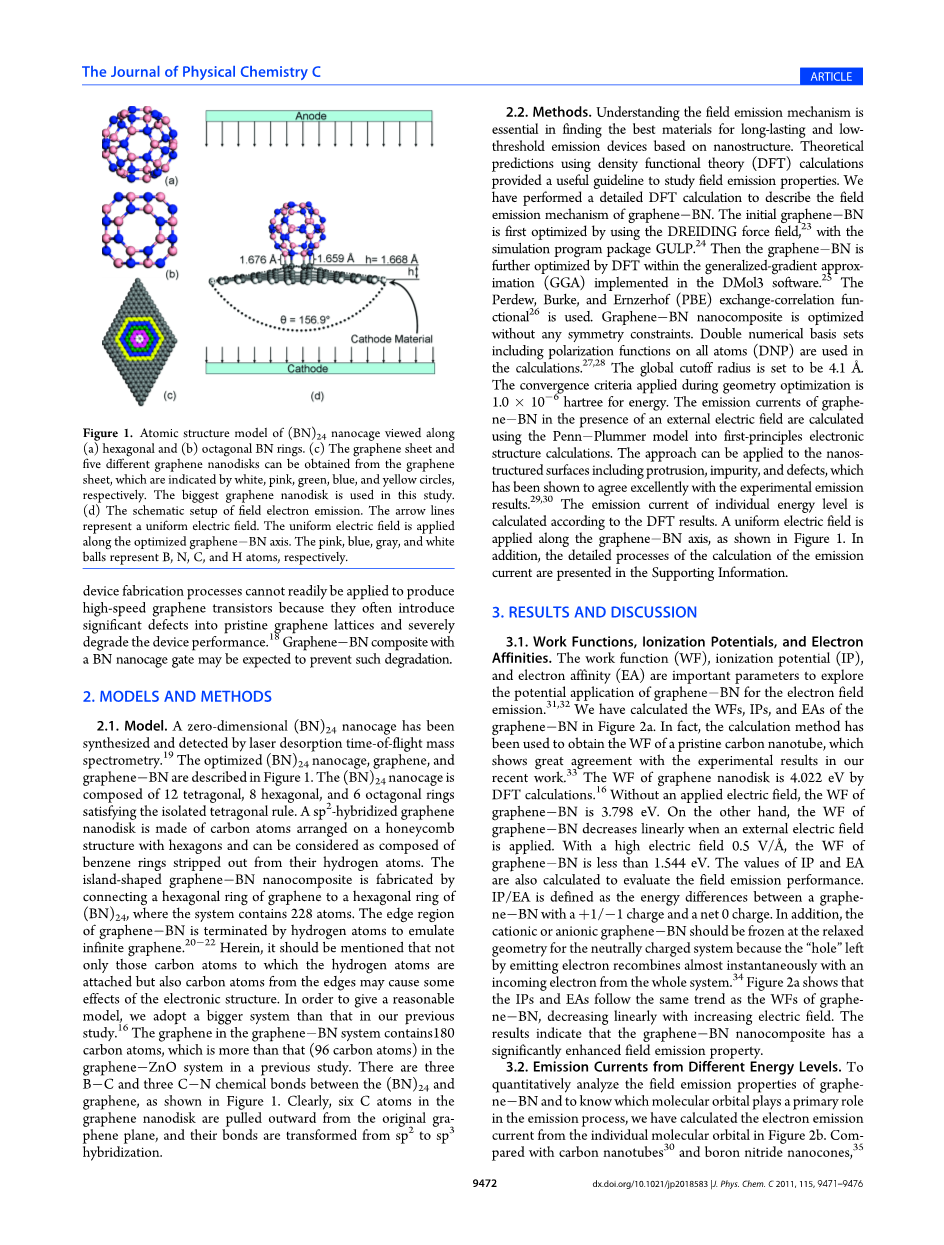 近年来,石墨烯-金属氧化物纳米复合材料的合成方法有很多(ZnO,,,,和)。然而,石墨烯和金属氧化物也很难在没有6个额外碳的情况下形成稳定的纳米结构。由石墨烯和非金属组成的新型混合平台备受期待。人们还在努力研究如何制备具有新性能的新型杂化碳材料。事实上,一种混合碳纳米结构最近被报道出来,出现了所谓的碳纳米芽,其中c60-bucky-球共价地附着在单壁的侧壁上碳纳米管。实验和理论探究都表明,碳纳米管和都具有一定的优点。因此,碳纳米芽可以作为纳米电子器件或场发射的新构件。所以,我们有动机探索一种有前景的石墨烯—BN纳米复合材料,用于场发射电子源的潜在应用。特别是-主要的问题是研究石墨烯的发射场理论-BN的利用密度泛函数计算。