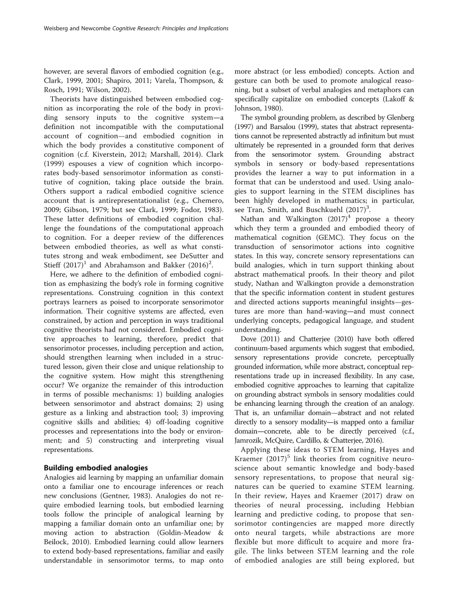 具身学习强调用具体的行为来支持教学目标。其中,一个特别的版本描述了一种从具体动作到抽象概念的转换过程,它是由手势、草图和类比映射这些方法支持的。并且这些方法看上去对于科学、技术、工程和数学(STEM)学科的学习有着特别的意义,这需要进一步的理论和经验来加以解释。Cognitive Research: Principles的论文集包括以STEM正式化和测试STEM中具身学习有效性为目的的文章。该论文集为此提供了指导,并标出了在进行大规模努力之前我们应该进行调查的领域。不仅如此,论文集还提供了一个更广泛的环境,其中包含了不仅能够支持具身学习而且非常适合STEM学科的机制。
