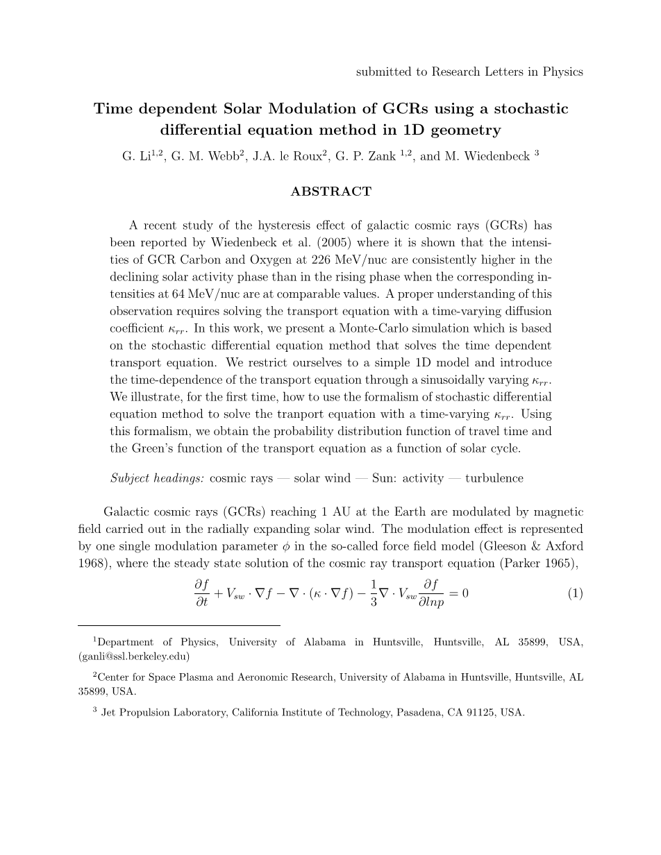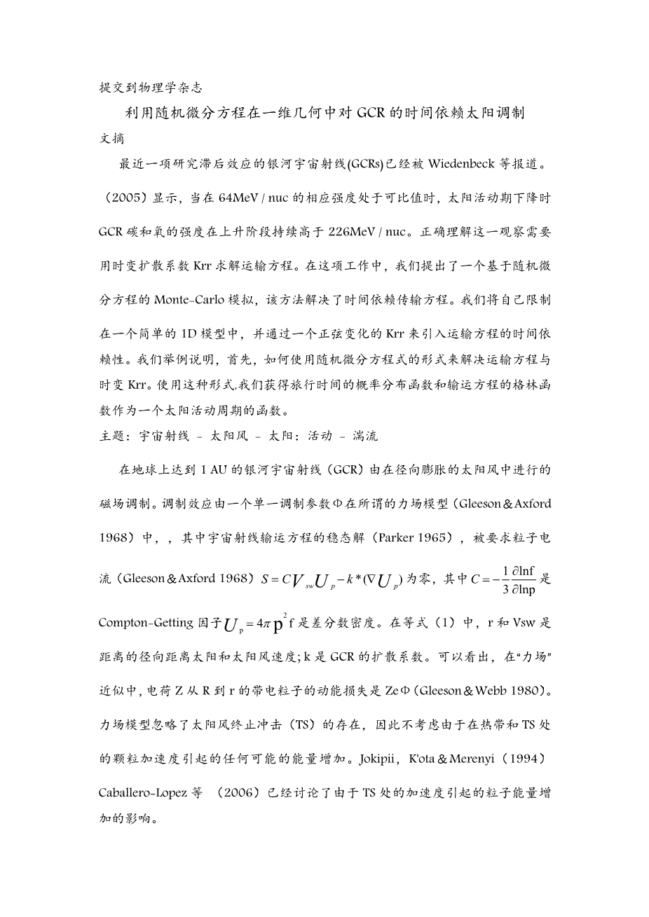 利用随机微分方程在一维几何中对GCR的时间依赖太阳调制外文翻译资料