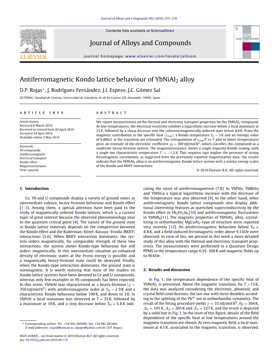 YbNiAl2合金的反铁磁近藤晶格行为外文翻译资料