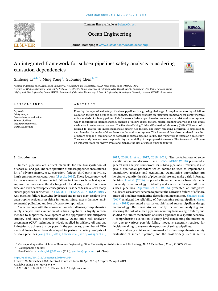 海底管道是海上油气运输的重要组成部分。海底管道的安全运行面临诸多不利因素,如腐蚀、疲劳、第三方活动、恶劣的环境条件(Lietal.,2016)。这些因素可能会导致意外故障事件的发生,如泄漏或破裂,可能导致油气的排放,生产停机,甚至灾难性的后果。在过去的几十年里,发生了很多海底管道事故(UKHSE,2011;PHMSA,2014;IOGP,2010)。任何涉及碳氢化合物释放的管道故障都可能升级为灾难性事故,造成人员伤亡、资产损失、环境污染和企业声誉损失。为了更好地应对上述挑战,我们强烈建议对海底管道进行全面的安全分析和评估,以支持制定适当的风险缓解策略,确保运营安全。定量风险分析与评估(QRA)技术在海洋油气行业中得到了广泛的应用。在过去的几年中,许多QRA方法被开发出来,用于对海上管道进行安全分析(Yangetal.,2017;Kawsar等,2015;Arzaghi等人,2017年,2018年;李等,2017年,2018年,2019年)。这里讨论了一些具体作品的贡献。DNV-RP-F107(2010)提出了海底管道的一般风险分析框架。然而,它只是给出了一个定性的程序,不能用来实施定量分析和评价。定量方法有助于对管道失效的风险进行量化,并做出风险知情的决策。Li等(2016)提出了一种基于贝叶斯网络的动态风险分析方法来识别和评估海底管道泄漏故障。Aljaroudi等人(2015)提出了一种综合风险评估方案,用于考虑降解机制的海上原油管道腐蚀失效预测。Shabani等人(2017)分析了自由跨越海底管道的可靠性。Hasan等(2018)提出了一种基于腐蚀风险的海底管道设计方法。但这些研究主要集中在分析和评估单一失效引起的海底管道的风险,研究特定情景下海底管道的失效机理。为了保证海底管道的安全运行,在决策时一般需要综合考虑各种可能的失效模式所带来的综合风险,对安全等级进行综合评价。