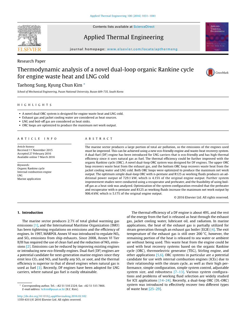 海洋空气污染的很大一部分是因为船舶燃料的燃烧,因此发动机必须改进。双燃料发动机可以实现使用一个对生态友好另外还可以回收废热的系统。双燃料发动机(DF)介绍了LNG船,环保,具有很高的热效率,因为它使用天然气作为燃料。热效率可以进一步提高有机朗肯循环(ORC)。新型的双回路设计了DF引擎ORC系统。ORC上循环从废气回收余热,与底环回收余热,用来冷却水和液化天然气。ORC环对系统进行了优化,产生最大的网输出。最简单的双回路的正戊烷和R125作为工作流体产生一个额外的功率输出功率为729.1千瓦,这是原发动机输出的4.15%。进一步的系统改进研究使用的换热器和预热器进行,以及利用汽化的可行性对散热气体进行了分析。系统配置的优化显示,预热器用正戊烷和R125作为工作流体的增加最大净输出功的换热器906.4千瓦,这是原发动机输出的5.17%。