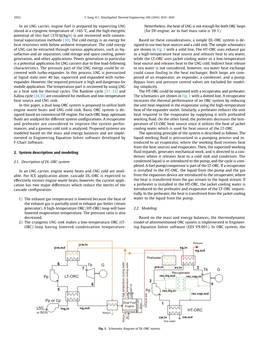 一个DF发动机热效率约为49%,其余的能量被用来加热天然气,夹套冷却水,润滑油及作为辐射释放。在海洋应用,部分用于排气的热通过废气锅炉产生蒸汽(EGB)[ 4 ]。排气出口的温度仍在200°C,然而,热量的剩余部分被释放到海水或环境中。发动机浪费的热量可以通过有机朗肯系统循环(ORC),热电发电机(TEG),斯特灵发动机,或其他应用来回收[5,6]。ORC系统发动机与蒸汽循环的关系,以及ORC发动机的高性能,简单的配置和系统控制,及系统可调性和坚固性,未来很可能是ORC系统发动机占主导地位 [ 7,13 ]。不同的系统配置和工作流体选择被广泛的用于冷却应用的研究[ 14,24 ]。近年来,双回路的ORC(dl-orc)系统被用来有效地回收2种不同类型的废弃热量[ 25 ],29 ]。