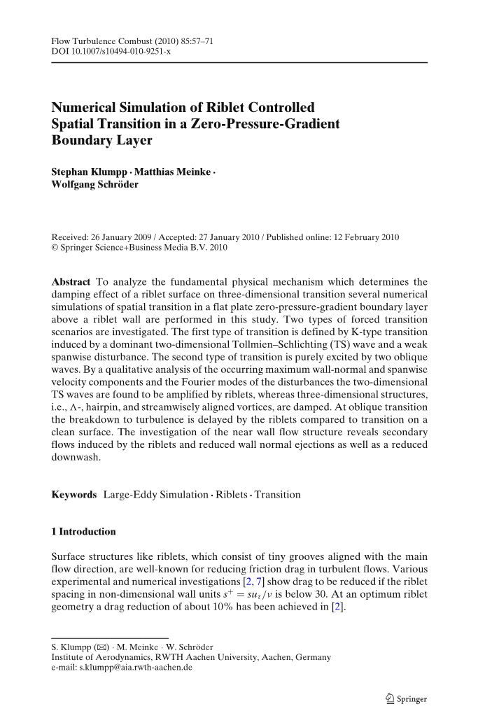 在这项研究中,为了分析在三维过渡脊状表面的阻尼效应的基本物理机理,在基于沟槽表面一个肋板的零压力梯度边界层过渡空间进行了几个数值模拟。实验对两种类型的强制转换进行了进一步研究。第一种过渡是由一个显性的二维TS波和一个微弱扰动衍生的K型过渡。第二种过渡是由双斜波激发的,通过对最大壁正常和跨度速度分量和傅立叶模式干扰的定性分析发现二维TS波被沟槽放大,而在三维结构结构中,像这样的情况,U型槽中紧密排列涡流是减小的。相比在一个干净平整表面的过渡,在倾斜表面的边界层过渡被沟槽延迟了。近壁流动结构的研究揭示了由沟槽表面引起的二次流,可以减少壁面正常射流[1]。