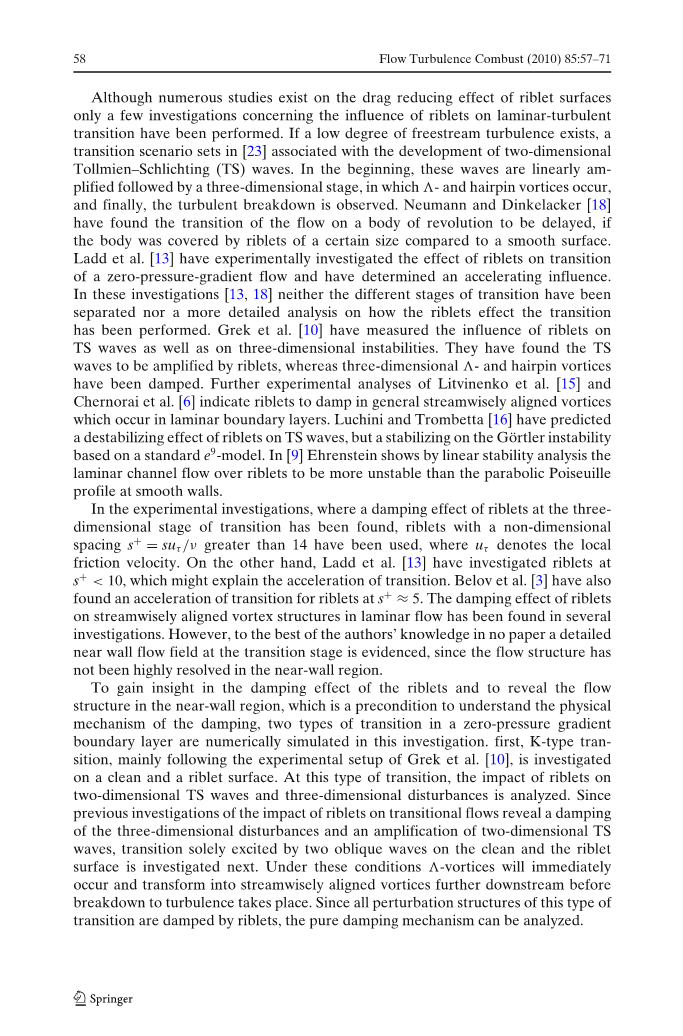 与主要流体方向在同一方向的由微小的沟槽组成的,像沟槽这样的表面结构,因其在边界流上能减少摩擦阻力而为人们熟知。多次试验和数值研究表明:如果沟槽的间距减少的无量纲壁单位S =sutau;/nu;低于30,就会产生减阻效果。已有研究表明一个最佳沟槽的几何形状可以达到10%的减阻效果[2]。虽然现在有很多研究是基于沟槽表面减阻效果,只有很少一部分研究是关于沟槽对层流边界层的的影响。如果有一层薄薄的自由流体边界层存在,过渡区[23]与二维TS波的发展有关。一开始,这些波是线性扩增后产生U型涡流的三维阶段,最后,湍流猝发。Neumann和Dinkelacker[18]已经发现如果旋转体由一定大小的沟槽表面覆盖,相比光滑表面旋转体的流动的过渡将会延迟,Laddetal[13]对在沟槽表面零压力梯度流动过渡的影响进行了调查研究,确定了沟槽表面的加速作用。但在这些研究中[13, 18],过渡不同的阶段没有被分别研究,沟槽表面如何影响过渡效果的分析细节也没有被提到。Greketal等人[10]已经检测了沟槽表面对TS波以及三维不稳定性的影响。他们发现该TS波被沟槽放大,而立体 - 和U形涡流则衰减。Litvinenko[15]和Chernorai [6]等人的进一步实验分析表明 沟槽结构限制了流向涡在层流边界层上的展向运动。