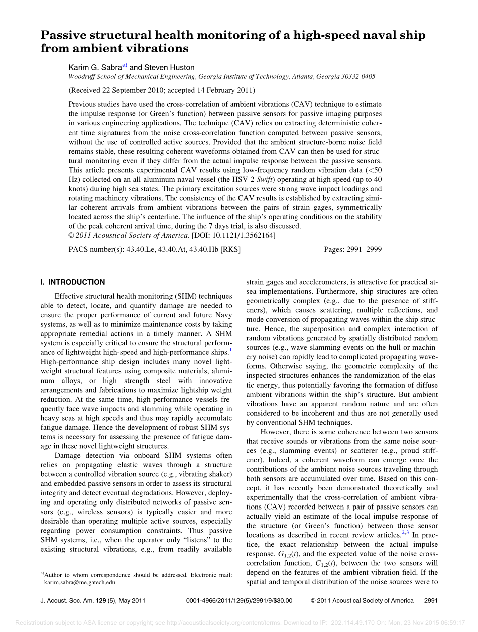 摘要:前期研究已经使用环境振动的互相关函数方法(CAV方法)实现仅在被动传感器之间估计脉冲响应(或格林函数),目的在于被动成像的各类工程应用。该方法(CAV)在不使用可控主动源情况下,依靠从被动传感器间接收的经处理的噪声互相关函数中提取特定的相关时间特征。只要环境结构噪声场保持稳定,利用CAV得到的最终相干波形可用于结构监测即使它们不同于实际的脉冲响应。论文给出了CAV方法的实验结果,实验数据使用采集于在高海况下以高速(可达40节)运行的全铝制舰艇的低频随机振动数据(lt;50Hz)。主要的激励来源是大浪的冲击载荷和旋转机械振动。CAV方法结果的一致性通过在对称分布于船舶中心线的一对应变计间的环境振动中提取相似的相干到达波来建立。同时,讨论了在7天周期内,船舶运行工况对相干到达波峰值到达时间稳定性的影响。