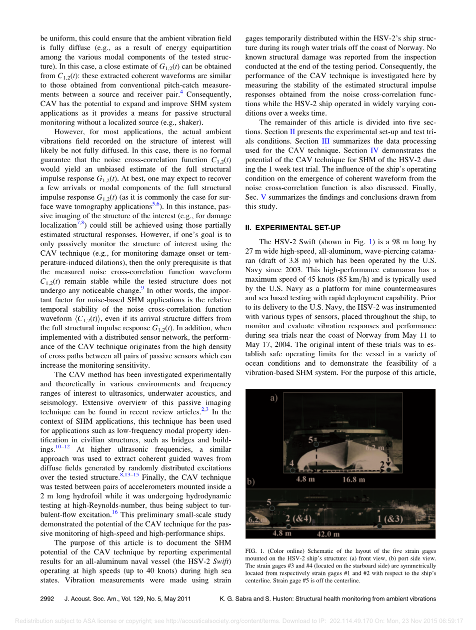 这部分的目的是证实CAV技术实施于HSV-2结构响应监测的可行性。然而,当使用第二部分描述的数据集进行证实时,遇到了两个实际的局限。第一,由于实验条件限制和所测结构的尺寸大小,没有关于HSV-2结构响应的独立测量(如利用振动筛进行传统的主动测试)。第二,由于应变计传感器的有限布置和多组分振动测量的缺少,不能证明所记录的HSV-2船上的实际环境振动场是否接近于完全散射场(即满足模态能量均分)。因此,由于这些实验限制,不能证实噪声互相关函数的到达时间结构和结构脉冲响应之间的对应关系。