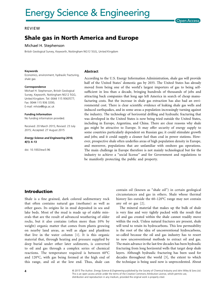 页岩是一种细粒,深色的沉积岩,通常包含天然气(甲烷)以及其他气体。它起源于沉积在海和湖床里的泥。大部分稳定的矿物泥浆是由曾经的久远的岩石风化作用的结果,但它也含有来自植物生长在附近的土地的有机物(通常是按重量超过10%),以及生活在水柱的藻类和浮游生物。正是这种有机材料,埋在其它后来的沉积物下面通过加热和压力,经过一系列复杂的化学反应转化为石油和天然气。所需的温度是60°C和120°C之间,温度较高时形成天然气,较低时形成石油。因此,页岩可以包含在特定的地质环境下形成的油(称为“页岩油”)以及在其它环境下形成的气体。页岩的历史温度在60 - 120°C范围之外可能不会生成任何石油或天然气。占页岩大部分的矿物材料非常好,非常紧密,石油和天然气的形成过程中创建的页岩岩石不能轻易移动。除非存在天然裂缝,页岩往往会保留其碳氢化合物。这个非常规的碳氢化合物具有低渗透,所以石油和天然气行业必须采取新的非传统的方法来提取石油和天然气。在过去的几十年里主要的进步是水力压裂已经从长水平井深入到深层页岩。虽然水力压裂已在世界各地使用了几十年,但现在所使用的技术程度是前所未有的。在美国每年大约有33000天然气井被开采,其中大约90%都是采用水力压裂技术,很少有新技术能达到这种效果。页岩气的倡导者认为页岩气有廉价能源、能源安全、经济增长和气候改良等优点。批评者认为页岩气是环境恶化的一个原因,并怀疑其经济效益是否是真实的或持久的。
