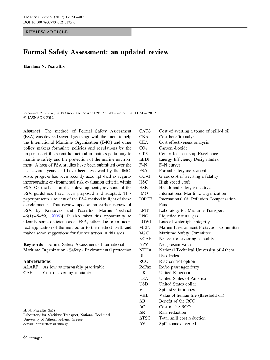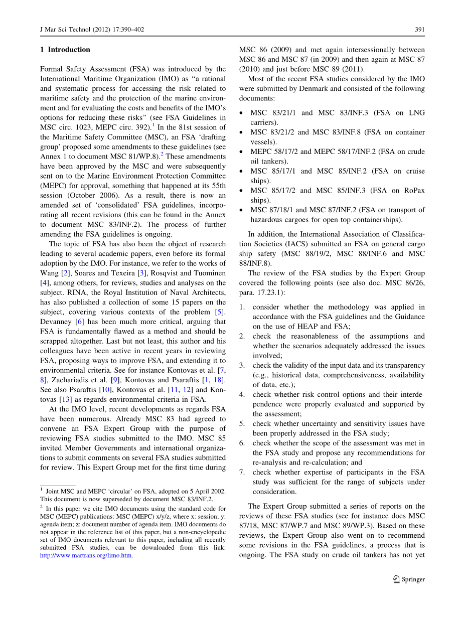 即使在海事组织正式通过之前,FSA的主题也是研究的对象,可以在几篇学术论文看出端倪。 例如,我们参考Wang [2],Soares和Texeira [3],Rosqvist和Tuominen [4]的作品,其中包括对该主题的评论,研究和分析。 皇家海军建筑师学会RINA也出版了大约15篇关于这个问题的论文,涵盖了问题的各种背景[5]。 Devanney [6]更为重要,认为FSA是一个根本的缺陷,作为一种评估方法来看,应该被完全报废。 最后需要指出的重点是,这位作者及其同事近年来一直在审查FSA,提出改进FSA的方法,并将其扩展到环境评估标准。 参见Kontovas等人 [7,8],Zachariadis et al[9],Kontovas和Psaraftis [1,18]。 另见Psaraftis [10],Kontovas等人 [11,12]和Kontovas [13]关于FSA的环境评估标准。