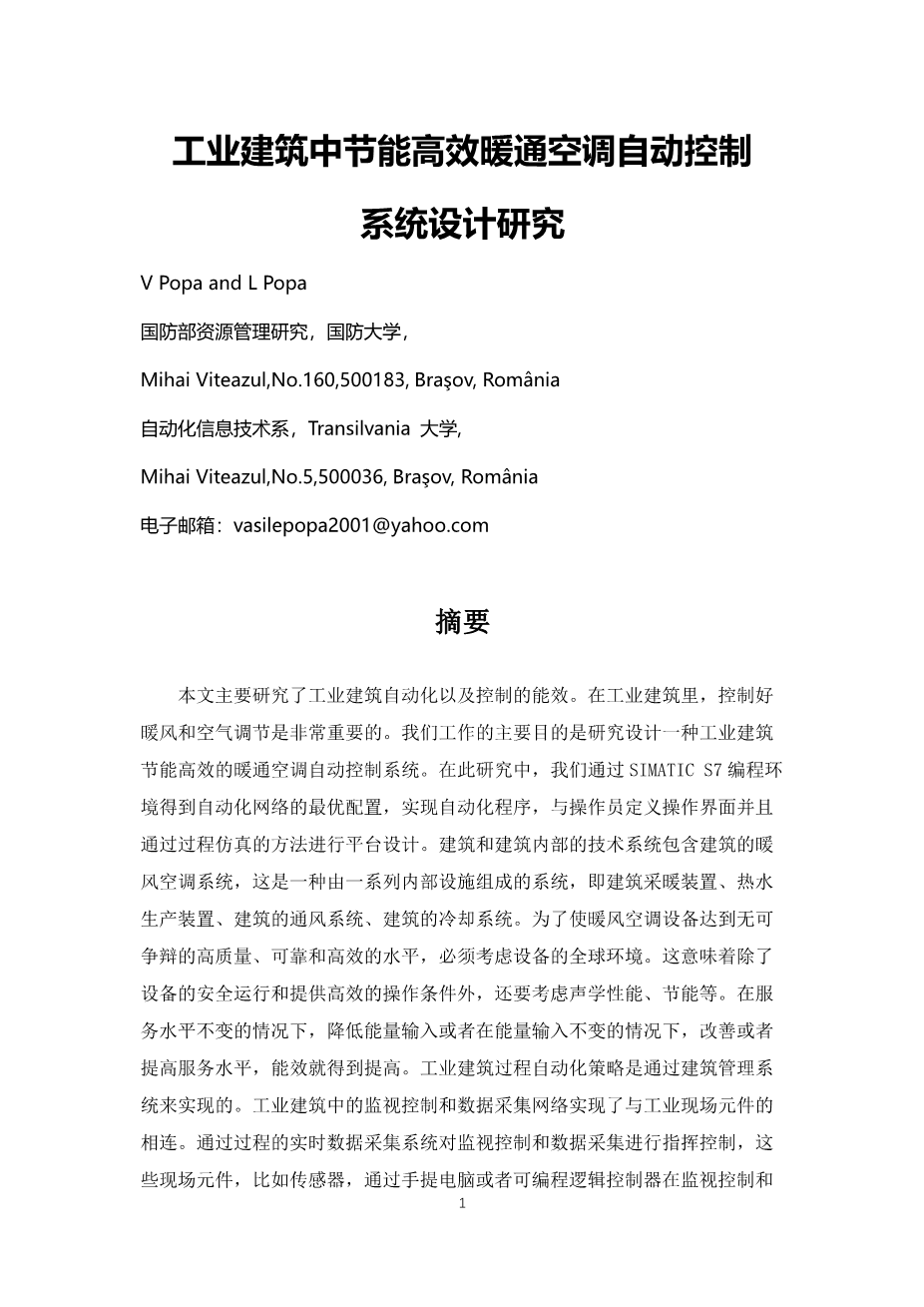 工业建筑中节能高效暖通空调自动控制 系统设计研究外文翻译资料