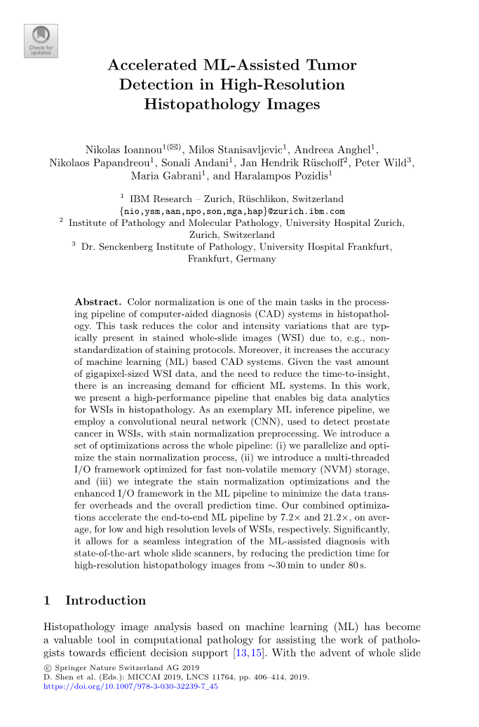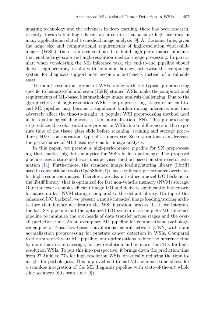 本文提出了一个高性能的染色标准化预处理模型,使组织病理学中的WSIs大数据分析可行。提出的模型采用了基于应变矢量估计的最新无监督方法[11]。此外,传统工具(OpenSlide)[1]中使用的标准图像加载/存储库(libtiff)对于高分辨率图像具有显著的性能开销。因此,我们还为libtiff库引入了一个新的I/O后端,它针对快速非易失性存储器(NVM)存储进行了优化。与默认库相比,我们的框架实现了高效的映像I/O,并提高了在快速NVM存储上的性能。在这个增强的I/O后端之上,我们提出了一个多线程图像加载/存储体系结构,进一步加速WSI读取过程。最后,我们将快速SN模型和优化后的I/O集成到一个完整的ML推断模型中,以最小化数据跨阶段传输的开销和总体判别时间。作为一个用于计算病理学的示例性ML模型,我们在WSIs中使用了基于Tensorflow的卷积神经网络(CNN)和染色规范化预处理来检测前列腺癌。与目前最先进的ML模型相比,我们的优化在低分辨率和高分辨率WSI上分别平均减少了7times;和21times;以上的推断时间。综合以上优化,它将高分辨率WSIs的判别时间从27.2分钟缩短到77秒,大大缩短了病理学家的观察时间。这种改进的端到端ML推断时间允许ML诊断模型与最先进的全滑动扫描仪(60s扫描时间[2])无缝衔接。