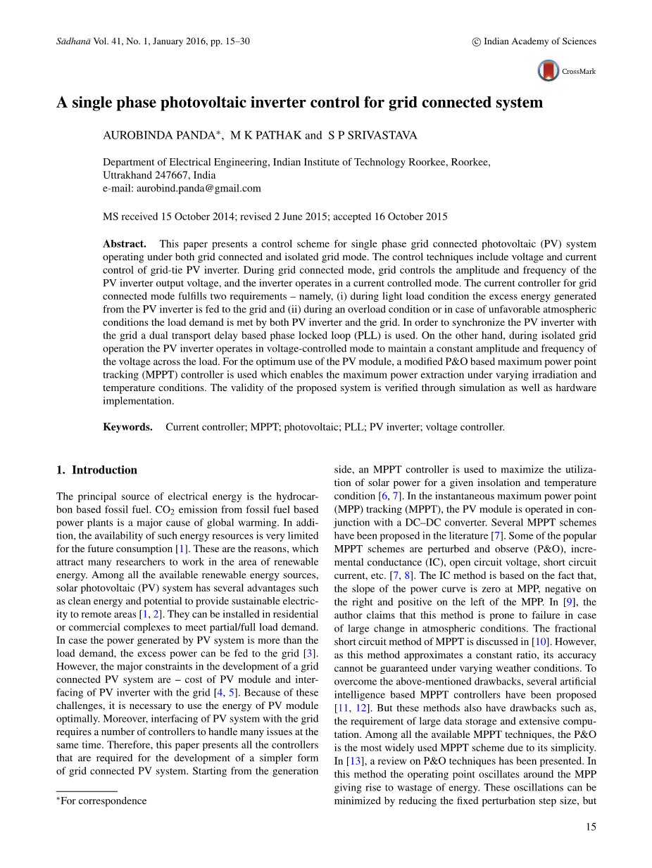 摘要.本文提出了单相并网光伏(PV)系统的控制方案在并网和孤立电网模式下运行方式。控制技术包括光伏并网逆变器的电压和电流控制。在电网连接模式,网格控制PV逆变器输出电压的幅度和频率,以及逆变器的电流控制模式下的工作。电网连接模式中的电流控制器满足两个要求,即(1)在轻负载状态下产生的过量能量从光伏逆变器被馈送到电网和(2)在过载状态或不利的大气条件的情况下的负荷需求是由两个PV逆变器和电网满足。为了将光伏逆变器与电网同步的双传输延迟基于锁相环(PLL)被使用。另一方面,分离的格运转时的PV逆变器在电压控制模式下工作,以保持跨负载上的电压的恒定幅度和频率。为了在PV模块中最佳利用,使用改性的P&O系最大功率点跟踪(MPPT)控制器使在改变照射和温度条件下得到最大功率提取。该系统的有效性,通过仿真验证以及硬件实现。