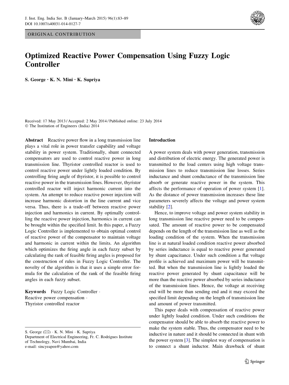 S. George (amp;) K. N. Mini K. Supriya Department of Electrical Engineering, Fr. C. Rodrigues Institute of Technology, Navi Mumbai, India e-mail: sincyeapen@yahoo.com |