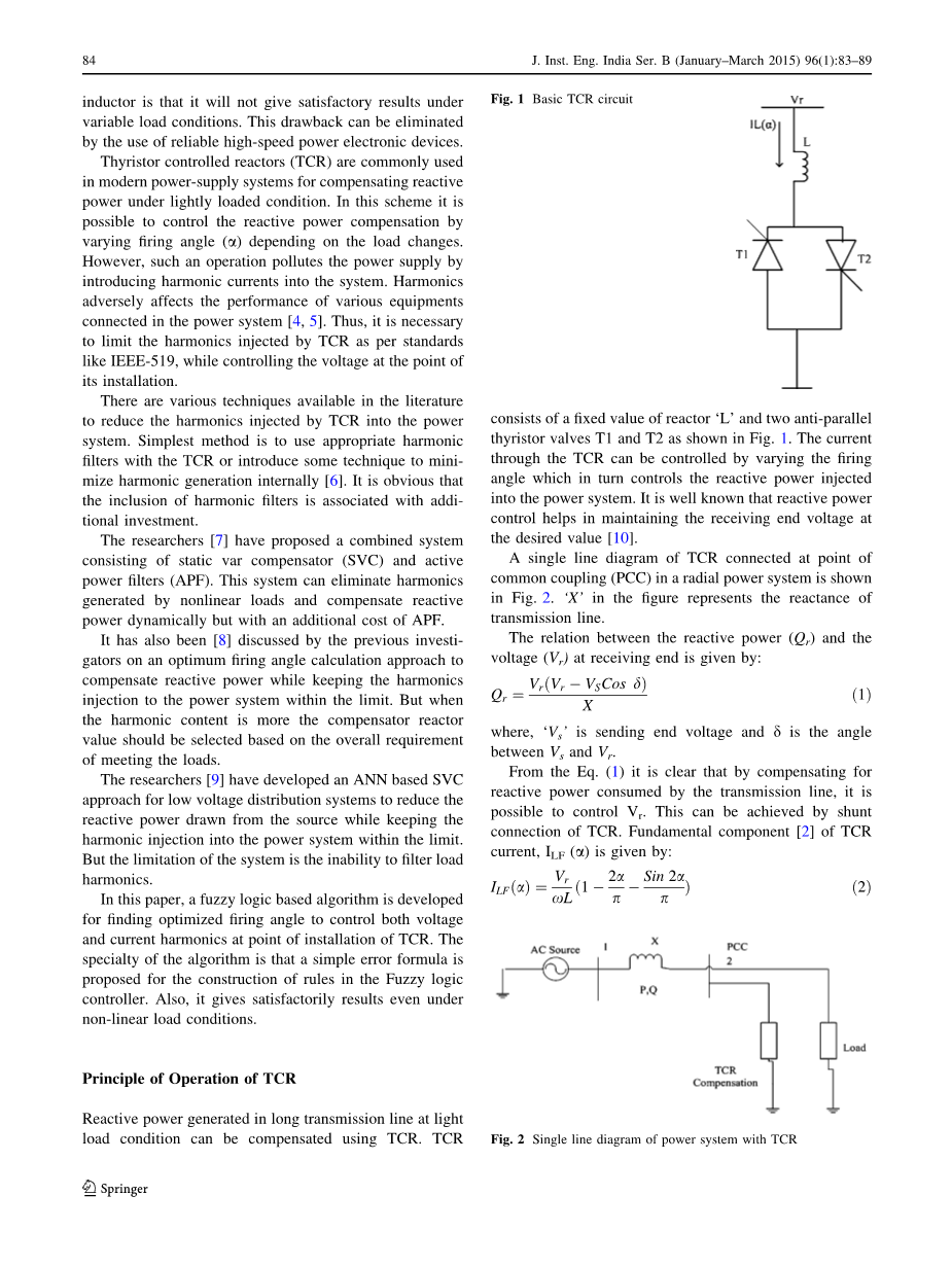 晶闸管控制反应堆(TCR)是在现代供电系统中常用的轻负载条件下的无功功率补偿。这个方案可以根据负载的变化控制不同的发射角大小从而控制无功补偿。 然而,这样的一个操作会将系统中的谐波电流引入,从而降低电源品质。产生的谐波会对电力系统中各种设备的连接性能产生不利影响 [4, 5]。因此,有必要像ieee – 519一样通过TCR按标准来限制谐波注入系统,从而在其安装点就可以控制电压。