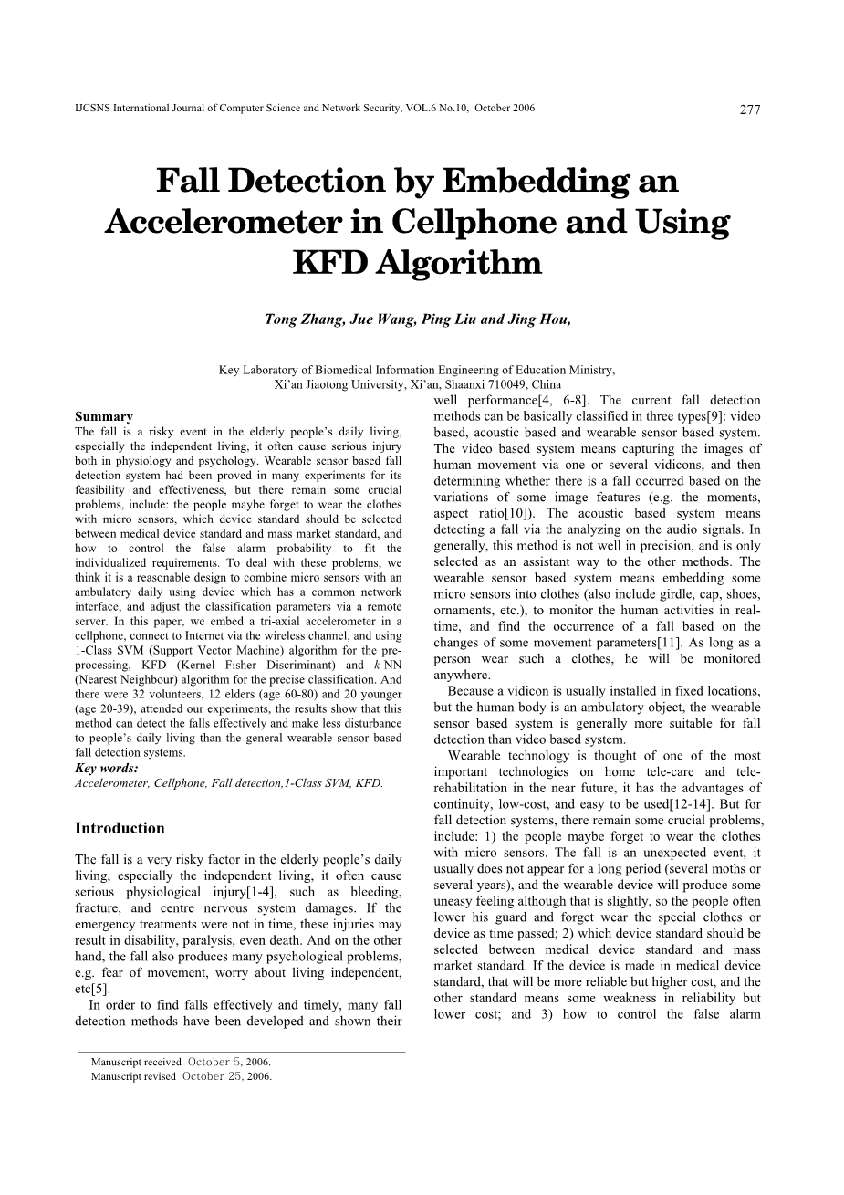 跌倒是老年人日常生活中的一个危险事件,特别是独立生活的老人,常常在心理和生理上对他们造成严重伤害。基于可穿戴式传感器的跌倒检测系统已经在许多实验中验证了它的可行性和有效性,但仍有一些关键问题,包括:人们也许忘了穿上佩戴有微型传感器的衣服,该设备的标准应选择医疗器械标准与大众市场标准之间,如何控制虚警概率拟合来满足个性化需求。为了解决这些问题,我们认为结合微传感器与每天使用的设备,并通过远程调整分类参数服务器是一个合理的设计。他们有一个共同的网络接口。在本文中,我们嵌入一个三轴加速度计手机,通过无线通道连接到互联网,并使用1类SVM(支持向量机)的预算法处理,KFD(核Fisher判别)和k-NN(最近邻)精确分类算法。有32名志愿者,包括12名年龄在60-80岁和20名在20-39岁的人,参加了我们的实验,结果表明该方法能有效地检测出跌倒,比一般的可穿戴式传感器为基础的跌倒检测系统减少对于人们的日常生活中的干扰。