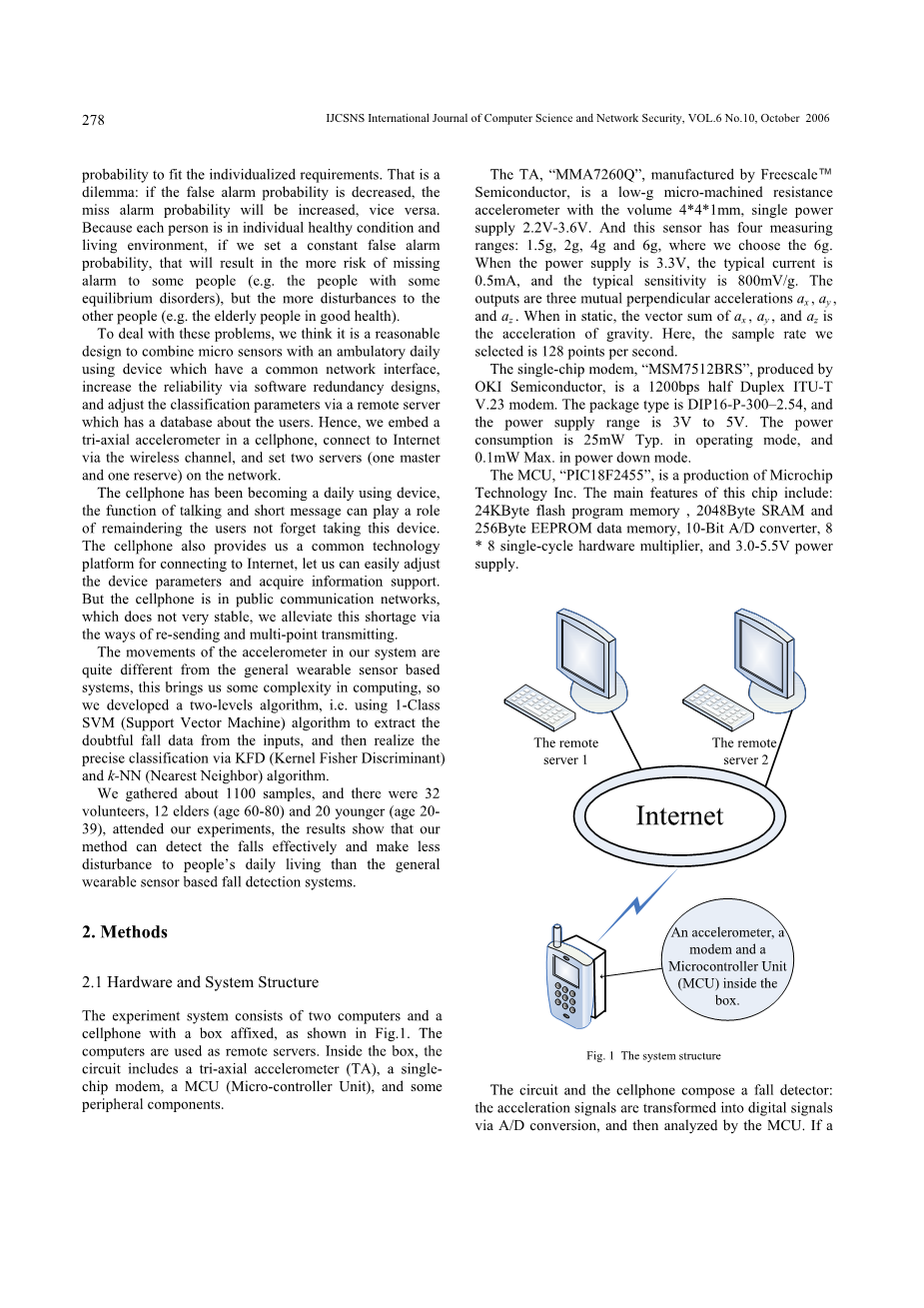 为了处理这些问题,我们认为结合微传感器与具有通用网络接口的每日动态使用装置是一个合理的设计,通过软件冗余设计提高可靠性,通过远程服务器调整数据库中有关于用户的分类参数。因此,我们在手机中嵌入三轴加速度计,通过无线通道连接到互联网,在网络上设置2个服务器(一个主和一个储备)。