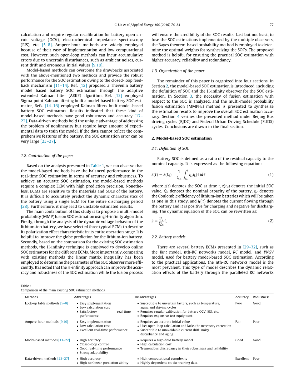 本文的其余内容分为四个部分。第2部分介绍了基于模型分析的SOC估计方法,其中还包括SOC的定义和SOC估计中的H无穷算法观测器;第3部分分析了融合估计对于SOC估计的必要性,以及多模型概率融合估计(MMPEE)方法所得估计结果能够显著提高SOC估计的准确性;第4部分阐述了本文所提SOC估计方法在北京公交系统(BJDC)和联邦城市交通系统(FUDS)的测试实验,测试的结果将来本文的最后部分说明。