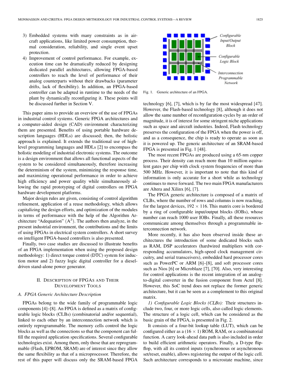 1)降低成本的方法有三种。只使用一个架构基于算法实现的特定需求,高度发达和具体方法的应用改进实现时间,也称为“上市时间”,和超大规模集成电路系统设计中预期的发展,允许集成一个完整的控制系统以其模拟接口在一个芯片上,也称为系统级芯片。2)保密,一个特定的体系结构,集成的技术公司是不容易复制的是具有保密性的。3)嵌入式系统与很多限制在飞机应用程序中,如有限的电力消耗,热考虑,可靠性和某一件事打断保护4)改善控制性能。例如,通过设计专用的并行体系结构执行时间可以显著减少,使得FPGA控制器达到的性能水平模拟同行没有他们的缺点(参数漂移,缺乏灵活性)此外,一个FPGA控制器可以应用在运行时需要的车间通过动态重新配置它。这些观点将V节中进一步讨论。