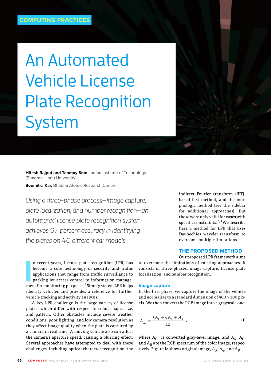 LPR的一个关键问题在于它需要应对大量的各种不同牌照,这包括颜色,形状,大小和图案的不同。同时还包括其它障碍比如恶劣的天气条件,照明差,相机的分辨率低,当车牌通过实时照相机捕获时,它们会影响图像质量。移动车辆也能影响相机的光圈速度,造成模糊效果。几个方法已试图对付这些挑战,包括光学字符识别,间接主快傅立叶变换(IFT)速的方法,以及基于形态学的方法(参见侧边栏额外的方法)。但这些只适用于特定的约束的情况下,我们在这里描述的LPR使用的是Daubechies小波变换,来同时克服多种限制的方法。