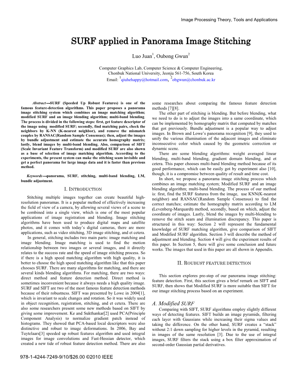 简而言之,我们提出了一种全景图像拼接的处理方法,其中结合了图像匹配系统、改进的SURF算法和一种图像融合算法,多波段融合算法。我们处理方法的过程是:第一步,从图像中找到SURF特征,用KNN(K最邻近)和RANSAC(随机抽样一致)算法找到正确的匹配图像;再根据LM(Levenberg-Marquardt)方法估计单应矩阵;第二步,根据单应矩阵调整图像坐标。最后,通过多波段融合算法融合图像消除拼接缝隙和照度差异。本文的结构如下:第二部分重述SURF匹配算法的基础知识,给出SIFT和改进的SURF算法的比较结果。第三部分将描述变换和融合的方法。第四部分将给出本文的实验结果。第五部分我们给出结论和未来的工作。本文所使用的所有图像将在附录中给出。