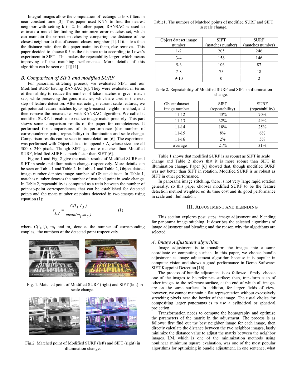 对于全景图像拼接过程,我们将SIFT算法和采用了RANSAC原则的SURF算法进行评估[6]。他们在给定的匹配集中减少错误匹配数量和保留正确匹配的能力方面被评估,这在下一步的特征检测中会被用到。在提取了尺度不变特征之后,我们用K最邻近原则得到了潜在的特征匹配,然后使用RANSAC算法删除错误匹配。我们称之为改进的SURF算法。它使得图像匹配更简洁。为保证论文的完整性,这部分将展示一些比较结果。它展示了在亮度和尺度变换上性能(一致的数量,重复率)的比较。比较的详细结果可以在文章[6]中可以看到。实验结果和对象数据集在附录A中展示出来了,所有的图像大小都是300*240像素。尽管SIFT比改进的SURF算法得到了更多的匹配,但是改进的SURF算法比SIFT算法快很多[6]。