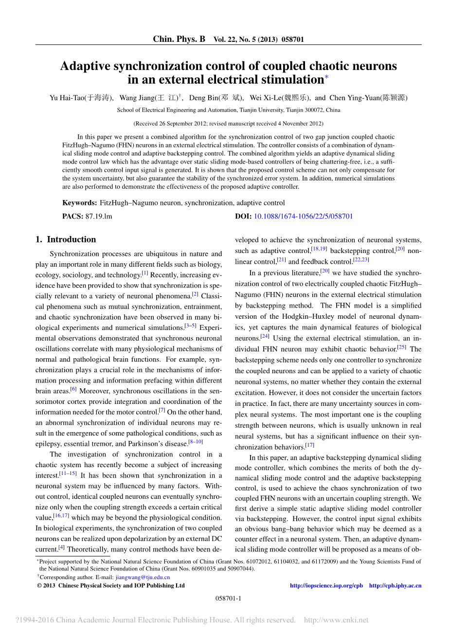 外电刺激耦合混沌神经元的自适应同步控制∗外文翻译资料