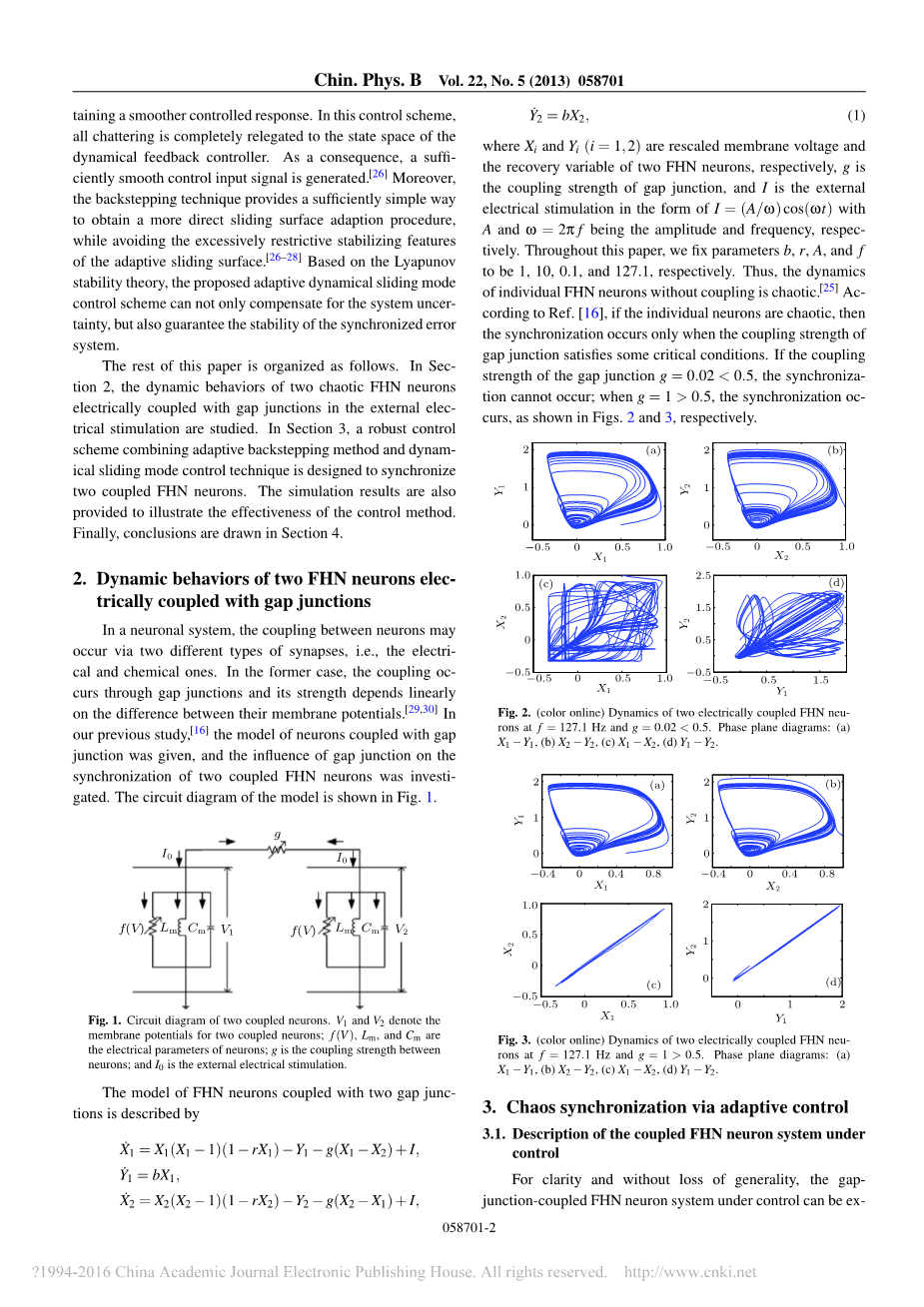 在以往的文献中,[20]我们研究了同步两个混沌化控制电耦合FitzHugh-Nagumo(FHN)通过反推法在外电刺激的神经元。[24] FHN模型是神经动力学的霍奇金–赫胥黎模型的简化版本,但捕捉生物神经元的主要动力学特征。[25] 使用外部电刺激,在个体FHN神经元可能会出现混乱的行为。反推方案只需要一个控制器来同步耦合神经元,可以应用于各种混乱的神经系统,无论它们是否包含外部激励。然而,它不考虑在实践中的不确定因素。在复杂的神经系统中,有很多不确定的来源。最重要的是神经元之间的耦合强度,这通常是未知的,在实际的神经系统,但其同步行为有显着的影响。[17]